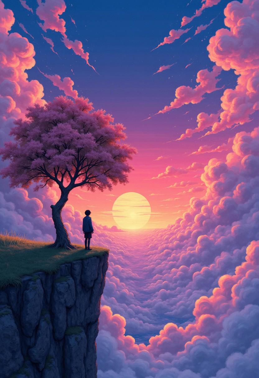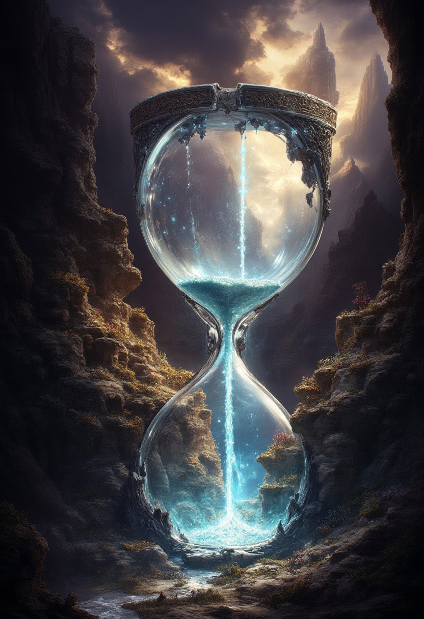 Improved cinematic photo, 35mm photograph, film, professional, 4k, highly detailed, aidmaMJ6.1, A colossal hourglass embedded in the side of a large garden connected to a barren battleground, spilling glowing sand into a valley, The hourglass is made of crystalline glass, its edges rimmed with intricate golden engravings that glint in the sunlight. The sand within glows with an ethereal blue light, spilling out from a crack at its base and cascading down the rocky slope into the void below, where it pools like liquid starlight. The surrounding landscape is a vast void, with jagged clifflike structures and patches of wildflowers growing in defiance of the rocky terrain. The sky above is dramatic, tinted in shades of amber, purple, and black, small animals wander the garden area their soft light adding a magical touch to the scene. The atmosphere is a blend of grandiose and mystical, capturing a moment that feels both ancient and otherworldly, as though the hourglass has been counting time since the dawn of existence.