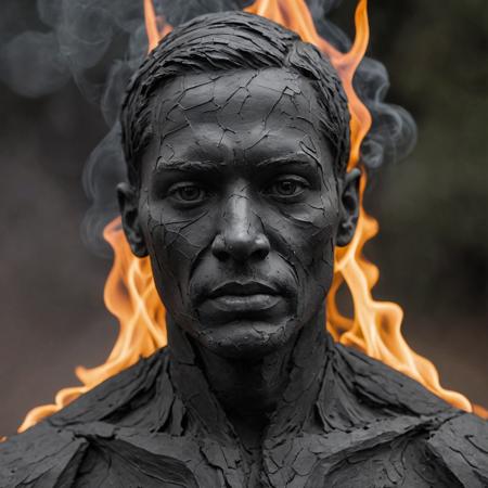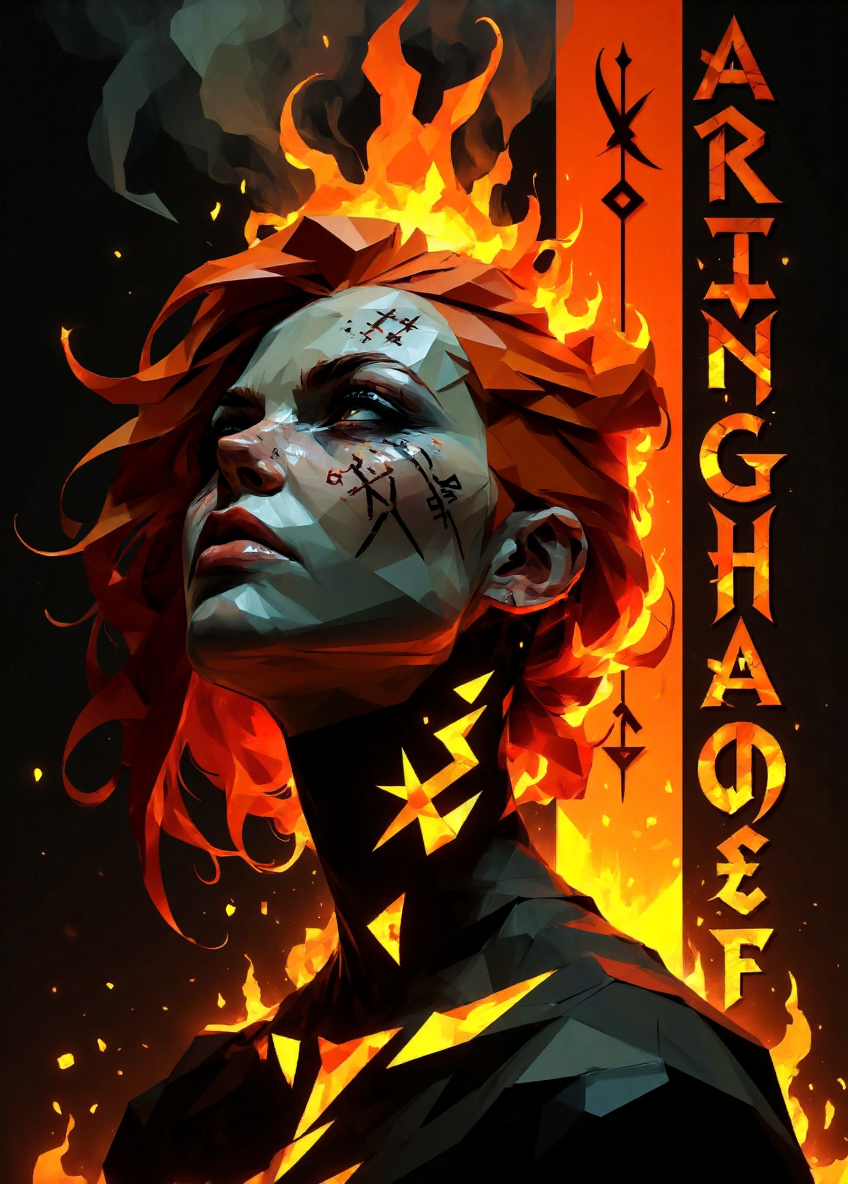 A low-poly art inspired Evrichev-style portrait of a beautiful girl, her features defined by sharp geometric shading and precise angular contours. Her head is tilted upward in quiet rebellion, her blank eyes shimmering with a mix of intensity and introspection. Her glowing orang hair is burning with intense flames. There are flowing embers and sparks in the air. Her dark red skin is adorned with glowing yellow tattoos. Fragmented glyphs cuts across the composition in vertical forms, merging text and figure into one visual and polygonal structure. The illumination from the top left casts deep, sculptural shadows, enhancing the interplay of depth and abstraction. The color palette is fire and glowing lava, emphasizing the infernal atmoshpere, with a dark background with wisps of smoke. The result is a magnificient synthesis of infernal iconography, twisted architectural form, and digital precision monument carved in colored light, embodying both evil and power.