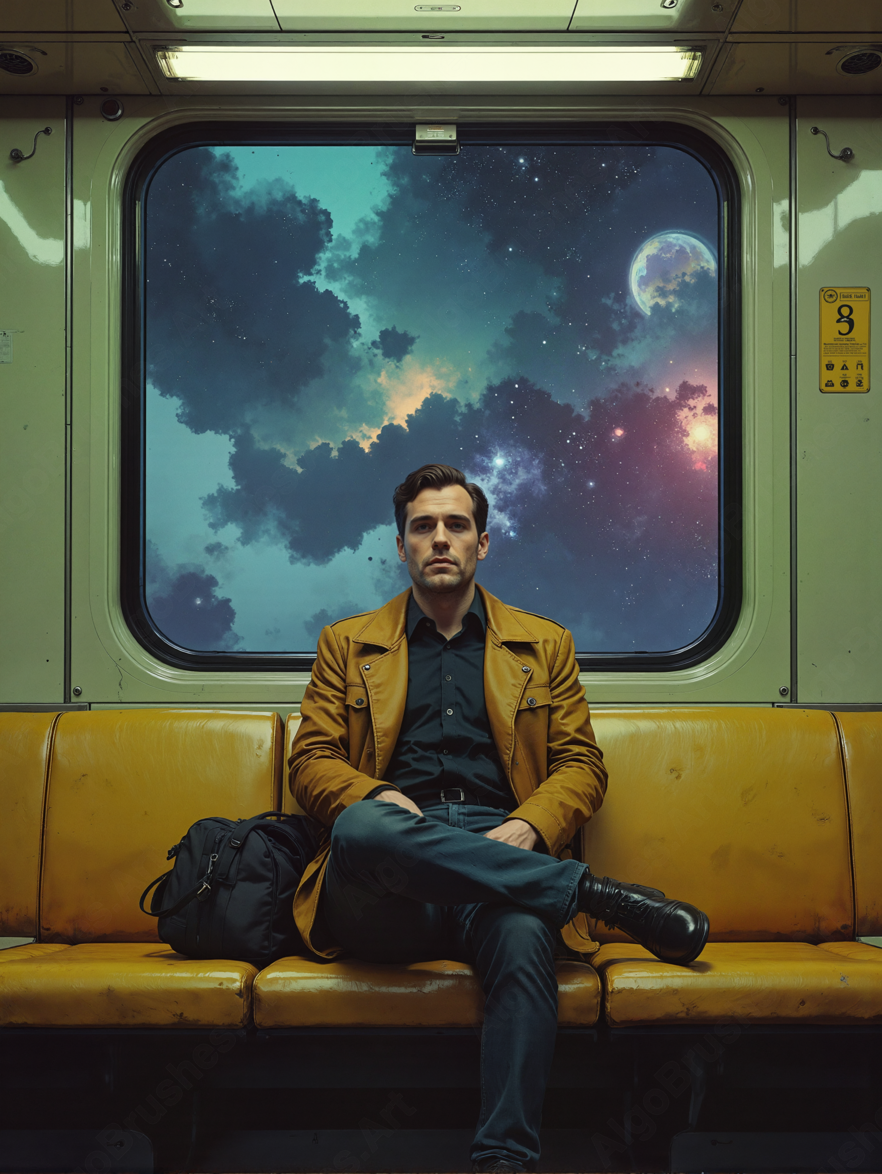An interior shot of a subterranean transport capsule, designed with a distinct mid-century modern aesthetic. A 30-year-old man sits alone, perfectly centered on a worn, mustard-yellow leather seat. He looks directly forward with a neutral, almost blank expression. The window next to him reveals not a tunnel, but a swirling, nebulous void of deep blues and purples, an impossible sight for an underground shuttle. The lighting inside the car is a flat, even, and slightly desaturated fluorescent glow, creating a sharp contrast with the vibrant, magical chaos outside. The atmosphere is a poignant mix of routine travel and breathtaking cosmic abnormality, highlighting the loneliness of his extraordinary journey.