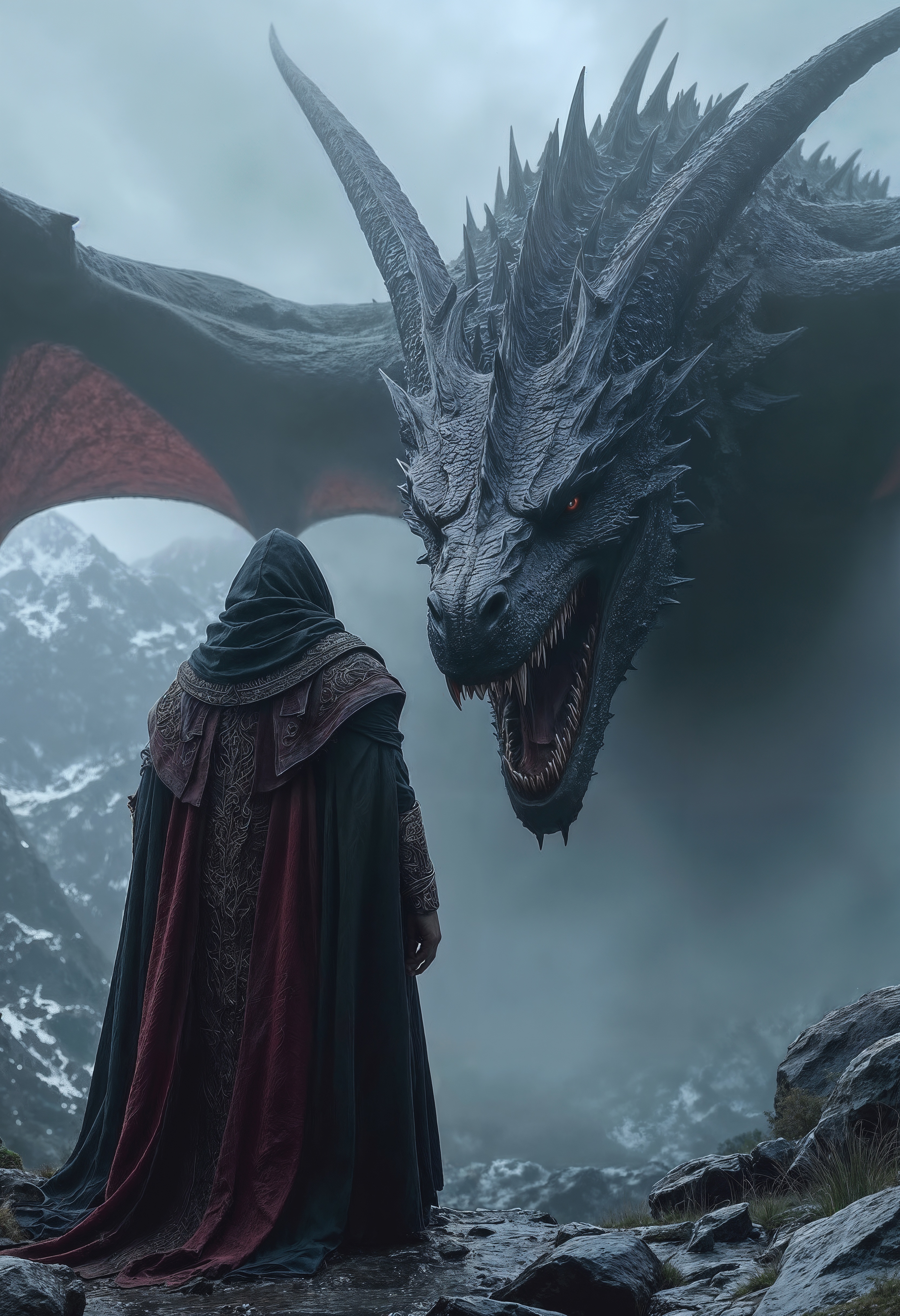 a dramatic scene with a large, menacing dragon and a cloaked figure. The dragon, with its intricate scales and sharp horns, dominates the background, its wings partially spread and its mouth slightly open, revealing sharp teeth. Its scales are a mix of dark red and gray, adding to its intimidating presence. In the foreground, a person stands with their back to the viewer, wearing a detailed, medieval-style cloak and armor. The cloak is deep red with intricate patterns, and the armor is metallic, with a weathered appearance. The setting is a rugged, mountainous landscape with snow-covered peaks and a cloudy sky, enhancing the epic and mystical atmosphere of the scene.