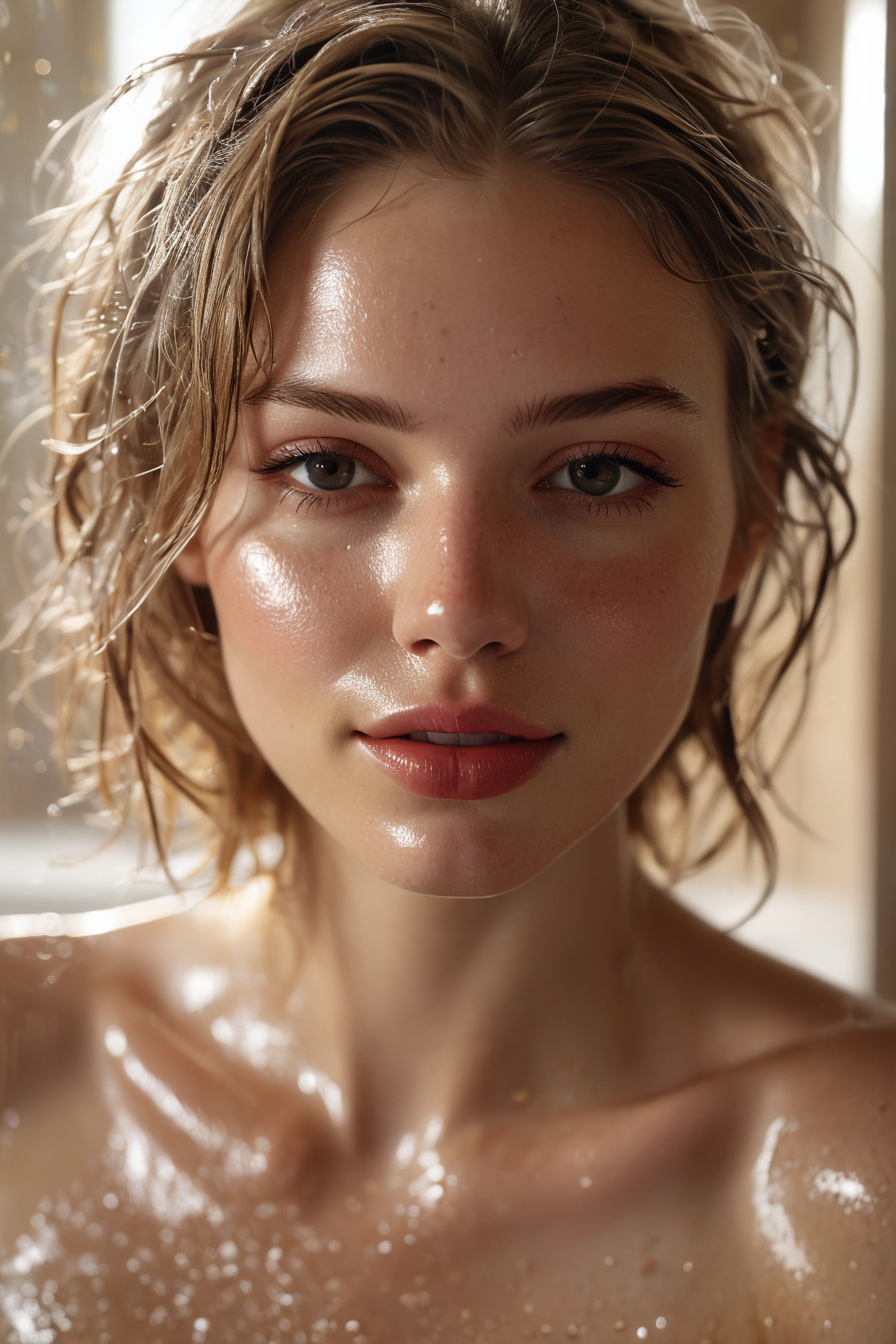 breathtaking Shimmering morning light indoor of a dirty bathroom bath filled with hot water, emerging from the water with splash a gorgeous face with smudged makeup of a girl sasha luss, depth of field, bokeh, shy smirk . award-winning, professional, highly detailed
