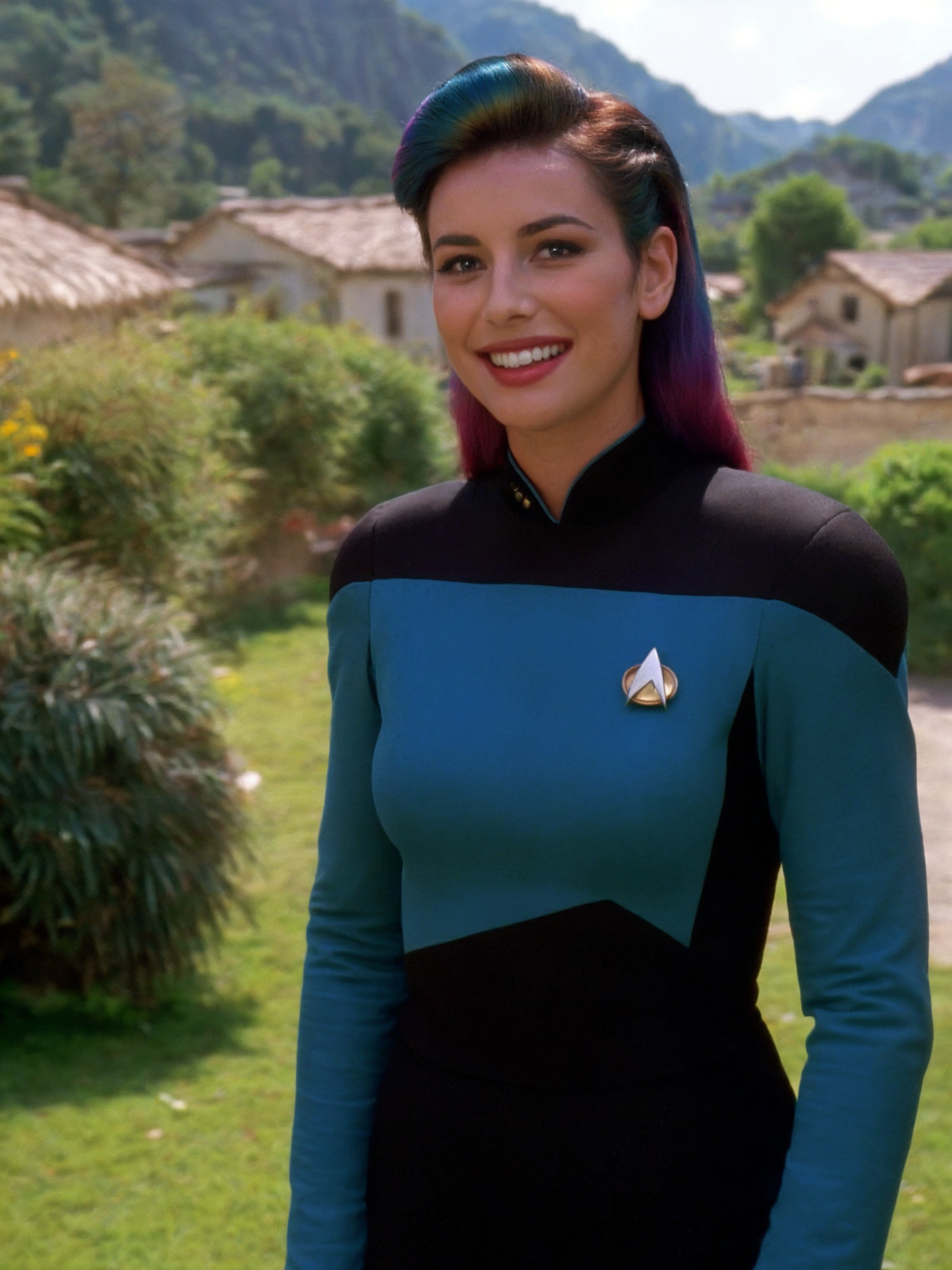 woman in blue and (black:1.1) s3stngunf uniform,rainbow hair,smiling,in a village <lora:TNGS3Standalone:0.8>