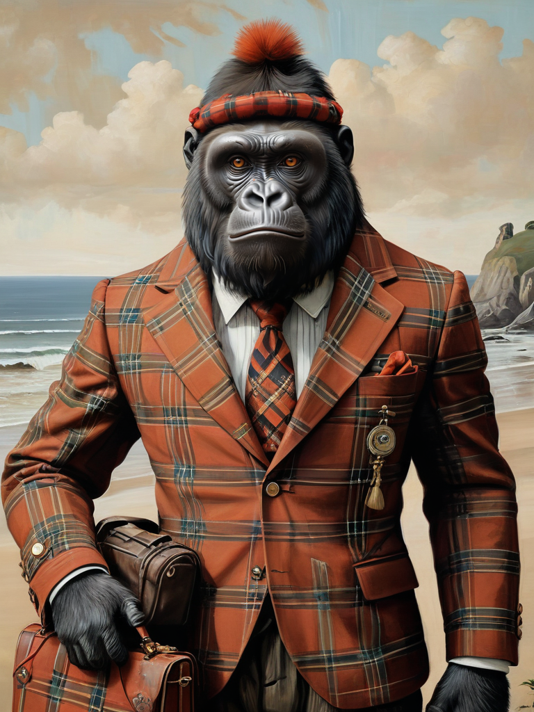 Masterpiece, (a close up:1.2) of a painting of (an antrhopomorphic gorilla:1.2) and luggage, (whimsical figure:1.3), (old fashion terracotta tartan suit:1.6), (very well dressed:1.5), in the style of Dee Nickerson, grungy patchwork, life-like avian illustrations, seaside vistas, romantic gestures, quirky shapes, romantic illustrations <lora:xl_more_art-full_v1:0.5> <lora:add-detail-xl:1> misc,, style by Ghibli