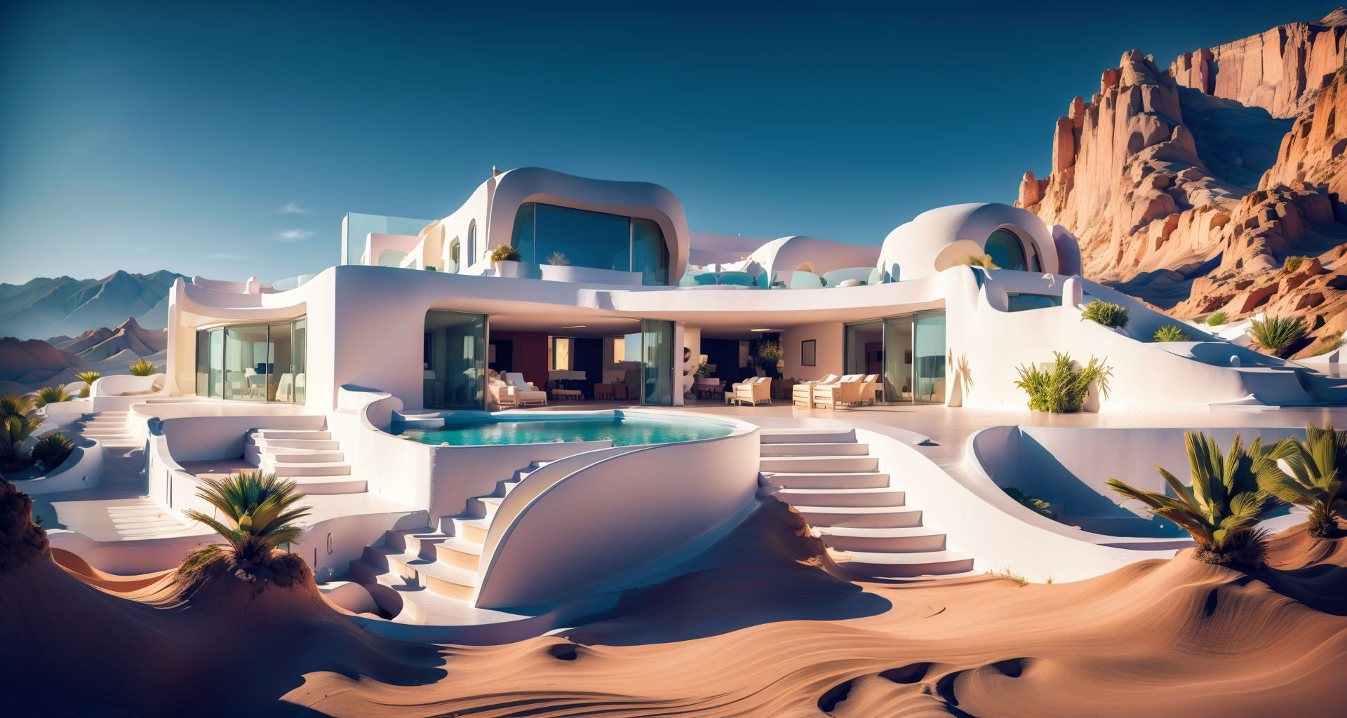 (masterpiece:1.3),(best quality:1.4),(ultra-detailed:1.1),(detailed light:1.1),(RAW photo:1.2),(photorealistic:1.4), villa,on a desert,gobi,rock,(white villa on cliff:1.2),<lora:fang_20230811104238:1>,<lora:20231007-1696670835833:0.6>, day,sunny weather,fresh flower,