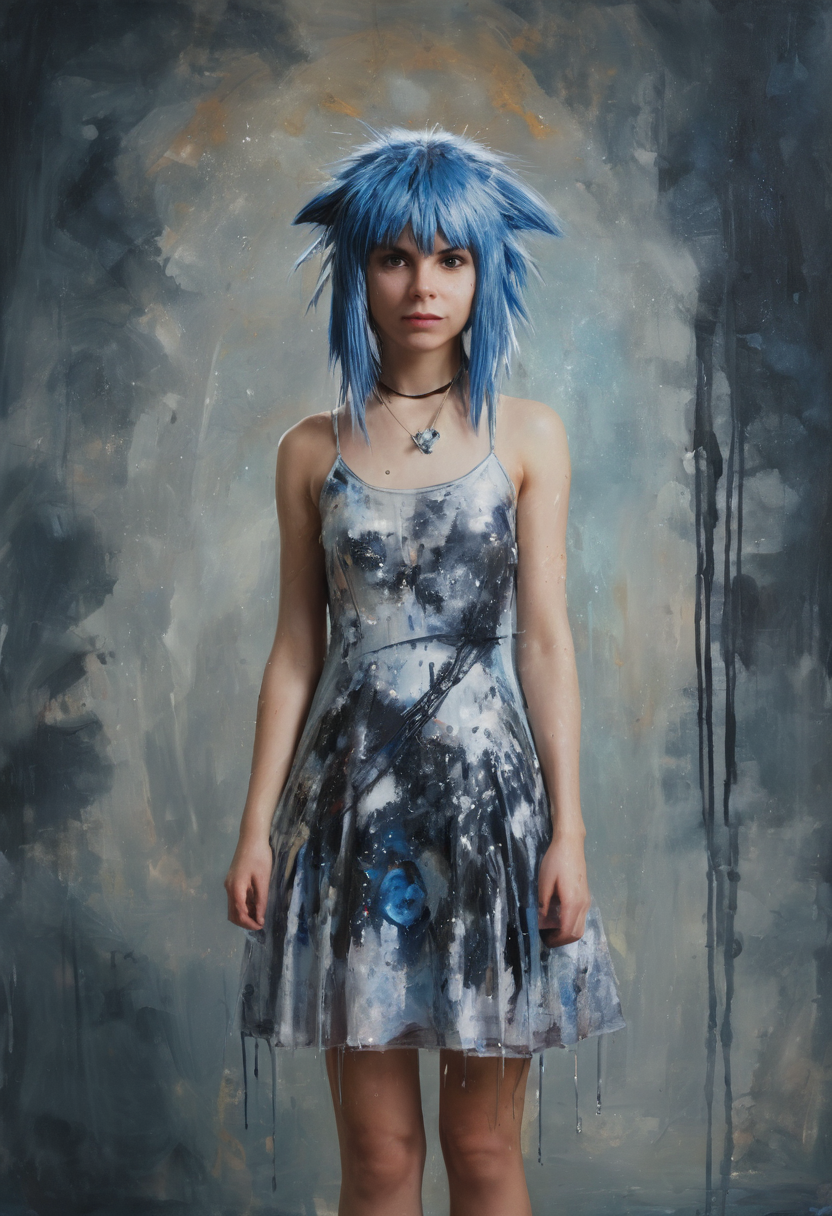 Hermitpunk, fairy tale, key light, Oil painting, tilt and drip painting art, Digital painting, flat lighting, (Sonic the Hedgehog:1.1) , Tired, she is dressed in Mini dress, her Mini dress is inspired by the Stargate SG1 series, Mullet hair, back-light, Instax