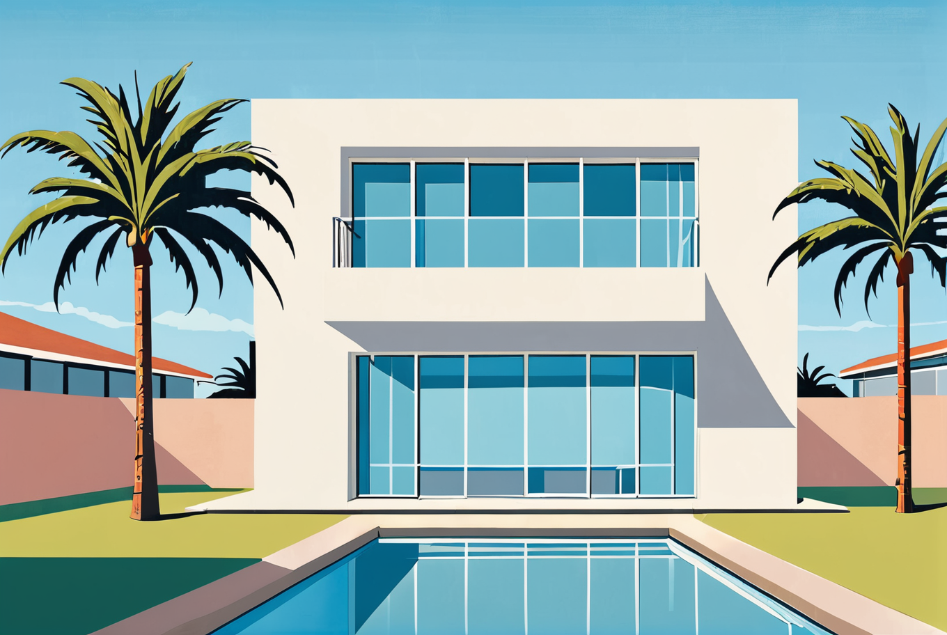 Art by Guy Billout simple, basic Pool, modern house, windows, palm tree, blue sky, clear sky, outside,