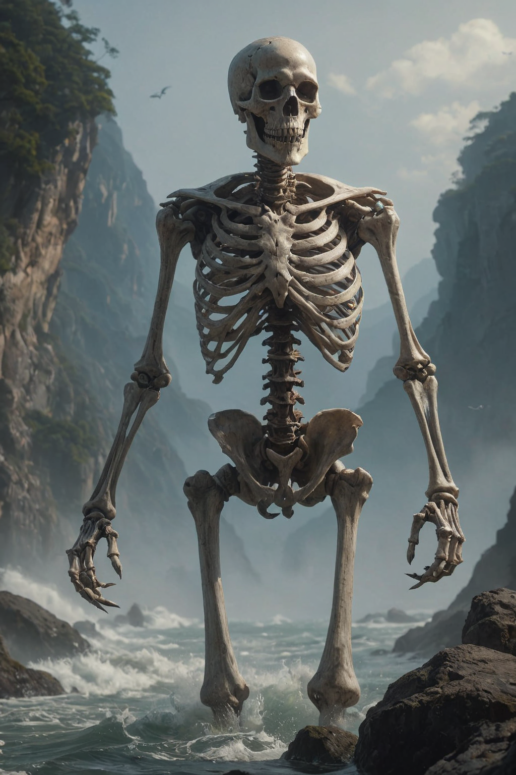 ultra realistic 8k cg, flawless, clean, masterpiece, professional artwork, famous artwork, cinematic lighting, cinematic bloom, ( Tidal Roar background ), a Skeleton, <lora:Fantasy_Monsters_XL:0.8> by zing wong wenjing, <DjC:5.11f6f1f 12afdd8f35f8f30fff9ffc9fc,><BR