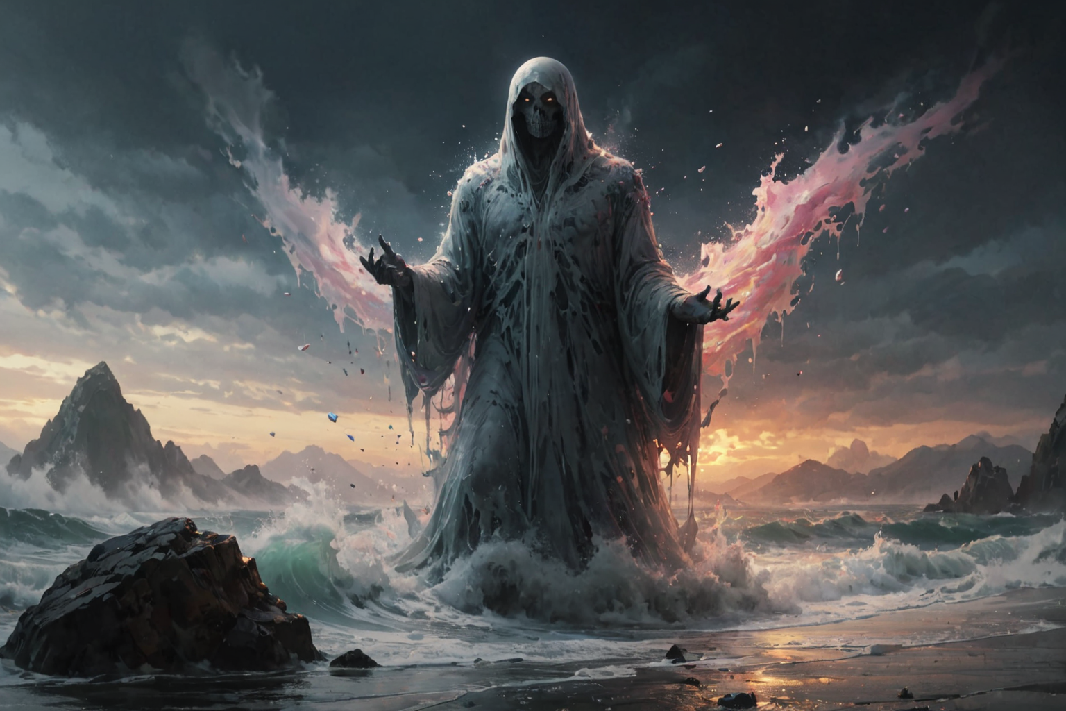 painted world, ultra realistic 8k cg, flawless, clean, masterpiece, professional artwork, famous artwork, cinematic lighting, cinematic bloom, ( Scouring Tsunami background ), colorful splashes in the shape of a Ghost, <lora:Fantasy_Monsters_XL:0.4> <lora:Painted World:0.45> by zoldz moong-h768
