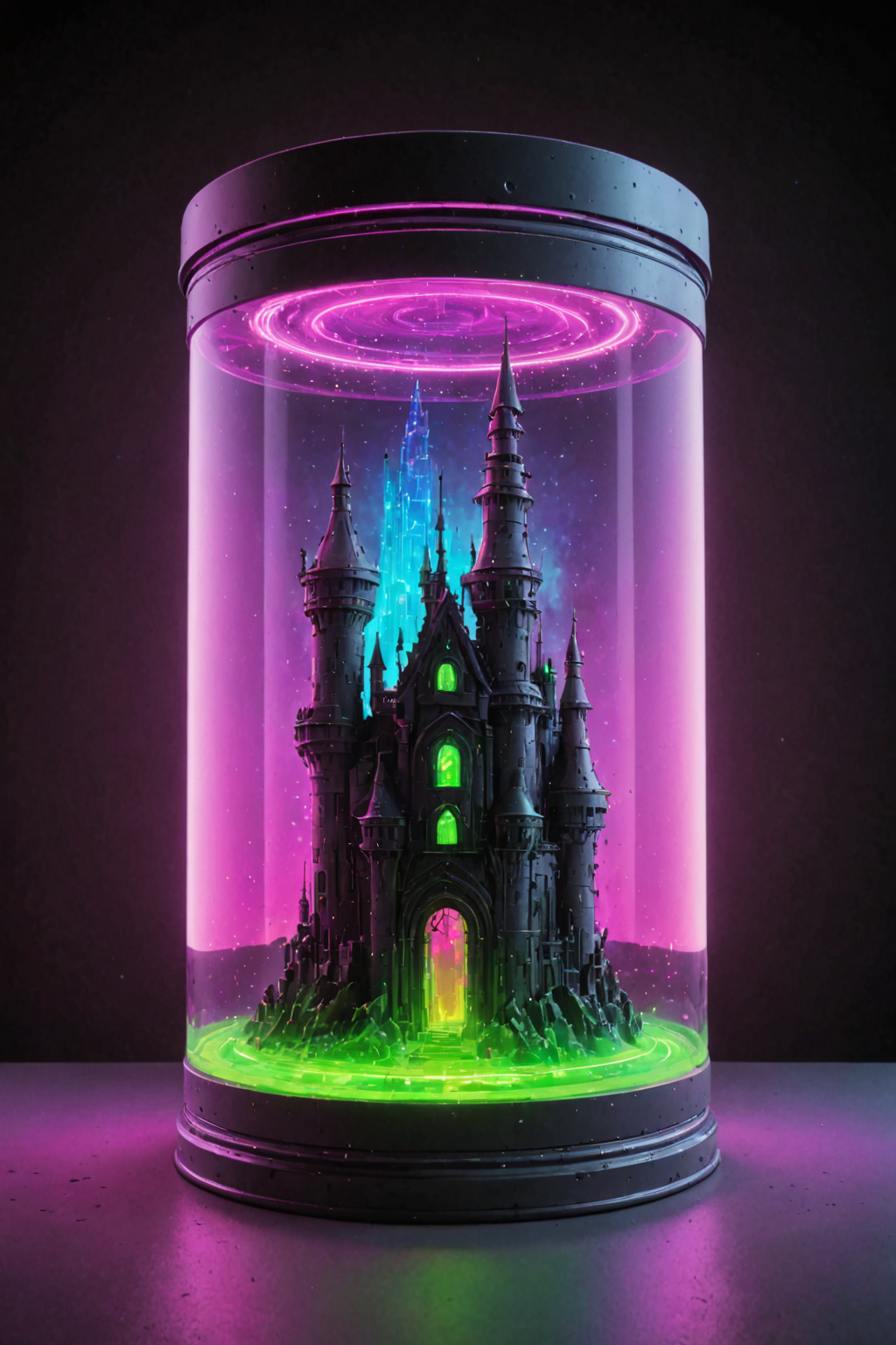 contained color, a colorful castle in a large cylindrical rectangular cyberpunk container with (neon green glass) , rainbow substance,<lora:Contained_Color_SDXL:.7>
