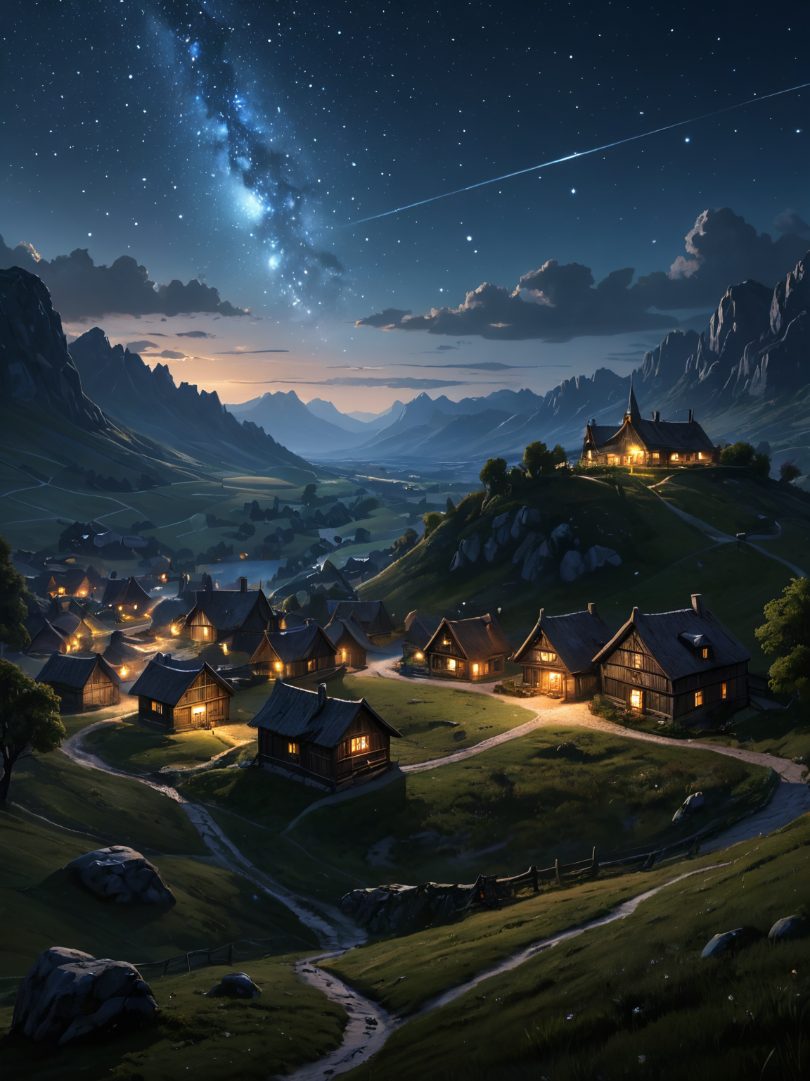 art by Vadim Meller, concept art, masterpiece, landscape of a village and Canis Minor constellation, Dramatic and Level, Bathed in shadows, Bardcore, specular lighting, F/8, epic fantasy