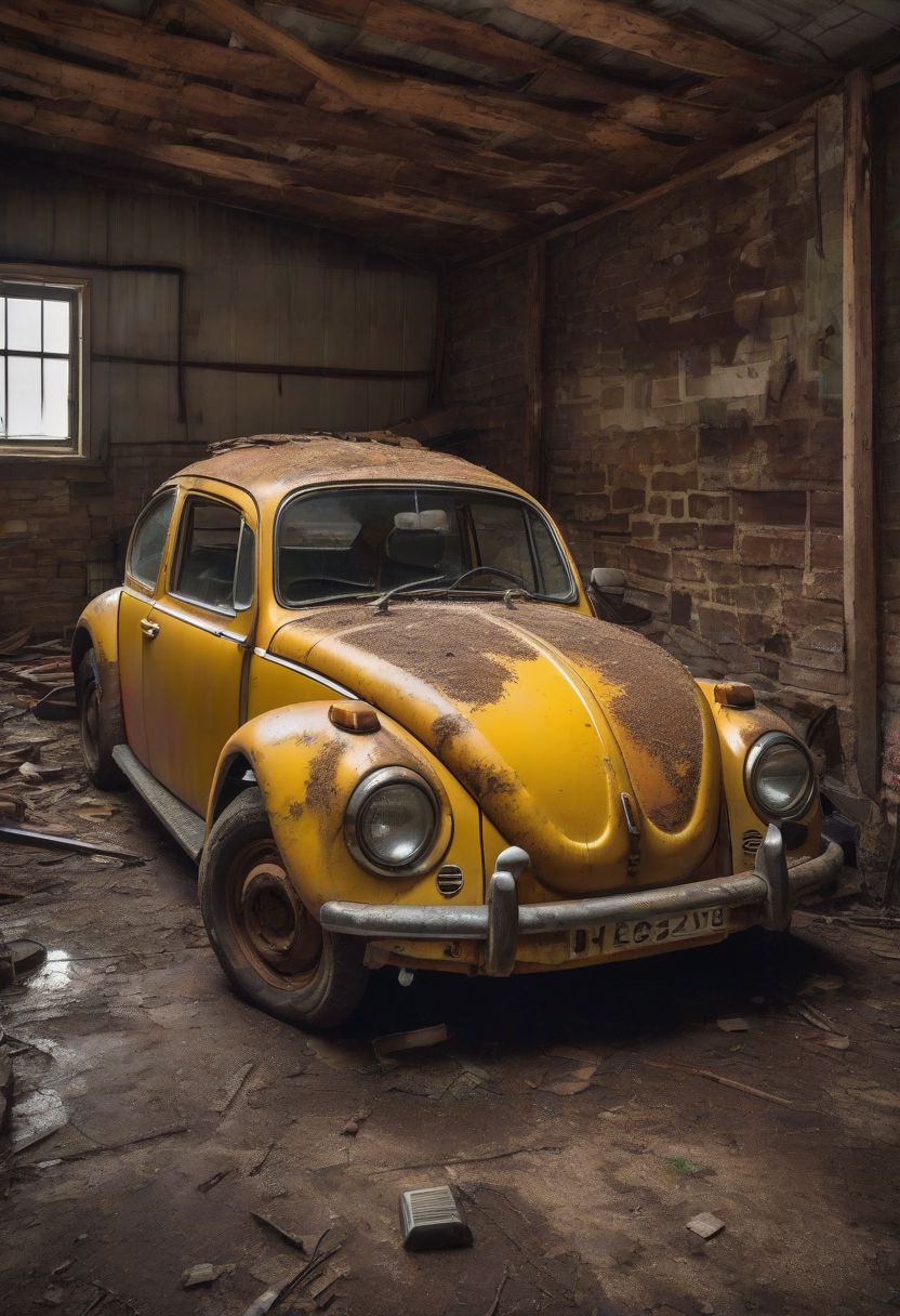 A nostalgic photograph of a rusty, weather-beaten Volkswagen Beetle, hidden away in a forgotten, abandoned shed. The car's once-vibrant yellow paint is now faded and chipped, with rust spots scattered across its surface. The inside of the car is cluttered with dusty items, giving the impression of a time capsule frozen in the past. The shed's wooden beams and walls are also weathered, with peeling paint and cracks, adding to the overall atmosphere of neglect and decay.