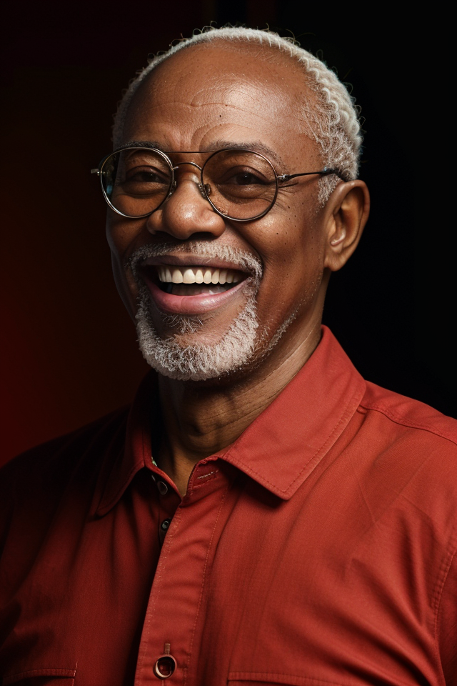 (blonde-glasses:1.2),1 old black man,solo,black hair,close-up,bald,laughing,simple background,red background,looking at viewer,<lora:CSG:0.6>, masterpiece,best quality,Ultra HD,high quality,HDR,UHD,8K,