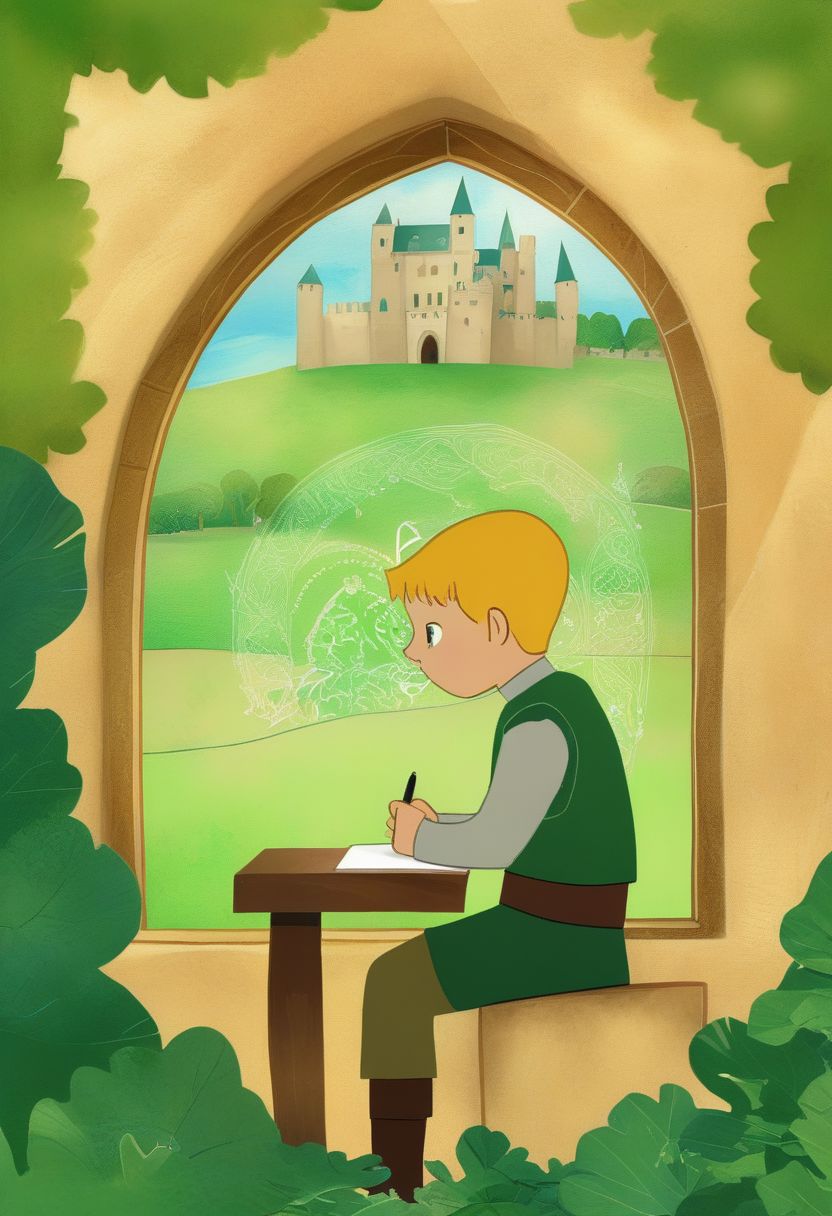 a stunning illustration, featuring a cute boy sitting by a window, writing on a wooden board with chalk. The board displays the phrase "PAseer" in a playful and artistic font. The boy has short, blond hair and wears a green knight armor adorned with intricate patterns. The background is a lush, green landscape with a castle visible in the distance