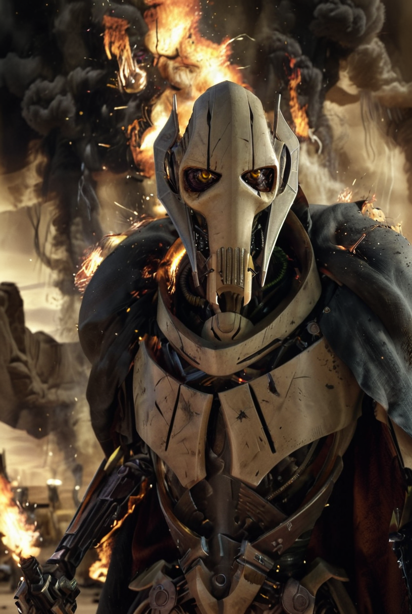(General Grievous medium close up), fire all around, explosions, holding weapons, black cape, menacing mood, film grain, detailed background, standing in desert, dark sky, stars, galaxies [reflections, dark lighting, light rays, beams of light, realistic, high quality photo, 4k, hd, ral-frctlgmtry] <lora:General_Grievous:0.7> <lora:xl_more_art-full_v1:0.4> <lora:add-detail-xl:0.6>