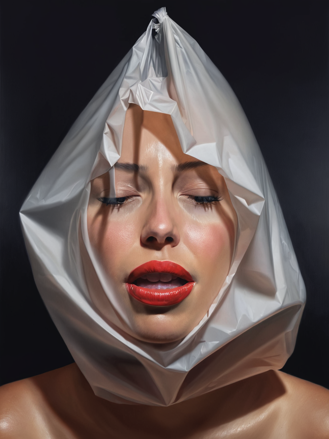plastic bag, A hyperreal painting of a beautiful woman with a plastic bag over her head, suffocaerting, mkdrgs style, raytracing, subsurface scattering, <lora:mkdrgs:0.75>