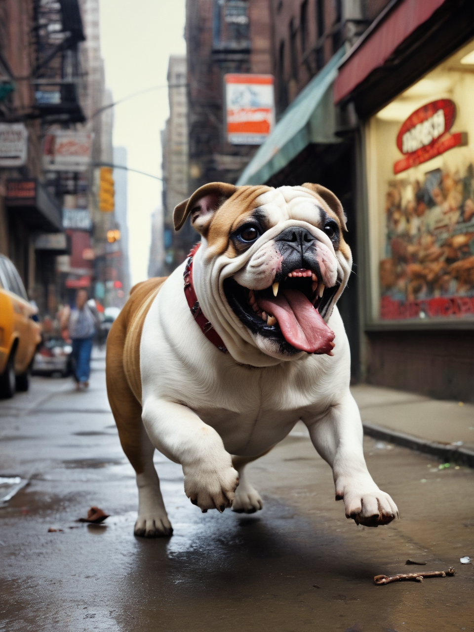 Grunge style Hyperrealistic art In gritty 1970s New York, a chubby bulldog . Extreme detail captures the bulldogâs fur, eyes, and motion, set against the cityâs graffiti-covered streets and bustling atmosphere, motion blur, dynamic sense of motion, movie still, photograph. . Extremely high-resolution details, photographic, realism pushed to extreme, fine texture, incredibly lifelike . Textured, distressed, vintage, edgy, punk rock vibe, dirty, noisy