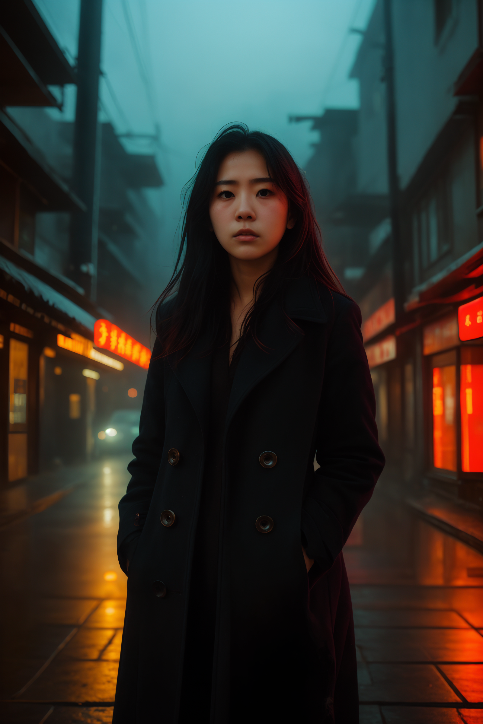 foggy, a young woman, night, city street, neon lights, moody atmosphere, urban, dark coat, long hair, pale skin, asian ethnicity, street photography, bokeh effect, ambient lighting, portrait, standing, looking at camera, mysterious, cinematic style, warm color tone, selective focus, low-light condition, fashionable, contemplative expression, young adult, <lora:foggy-000006:0.9:lbw=FOGGY>,