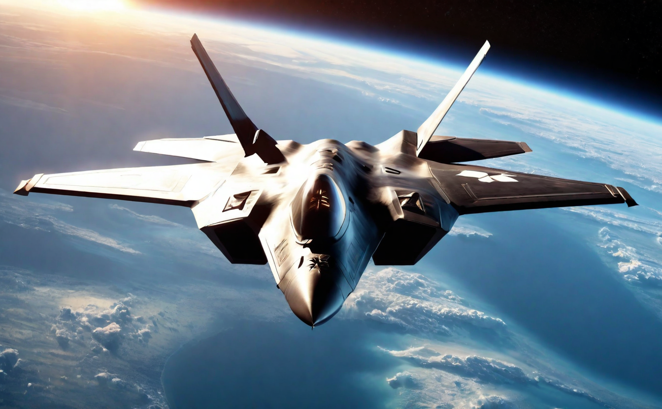 sleek incredibly detailed longitudinally symmetrical F-22 Raptor like sci-fi starfighter hangs in space above an earth-like planet, (industrial light and magic effects)1, (super-realistic CGI model)1, cinematic composition, motion blur