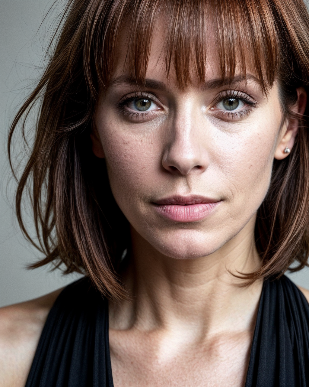 A close up portrait of 32 y.o Quebecoise woman looking at camera, slim body, (Mylne Farmer:0.99), dark theme, soothing tones, muted colors, high contrast, (natural skin texture, hyperrealism, soft light, sharp), (((perfect face))), grunge clothes, Cannon EOS 5D Mark III, 85mm