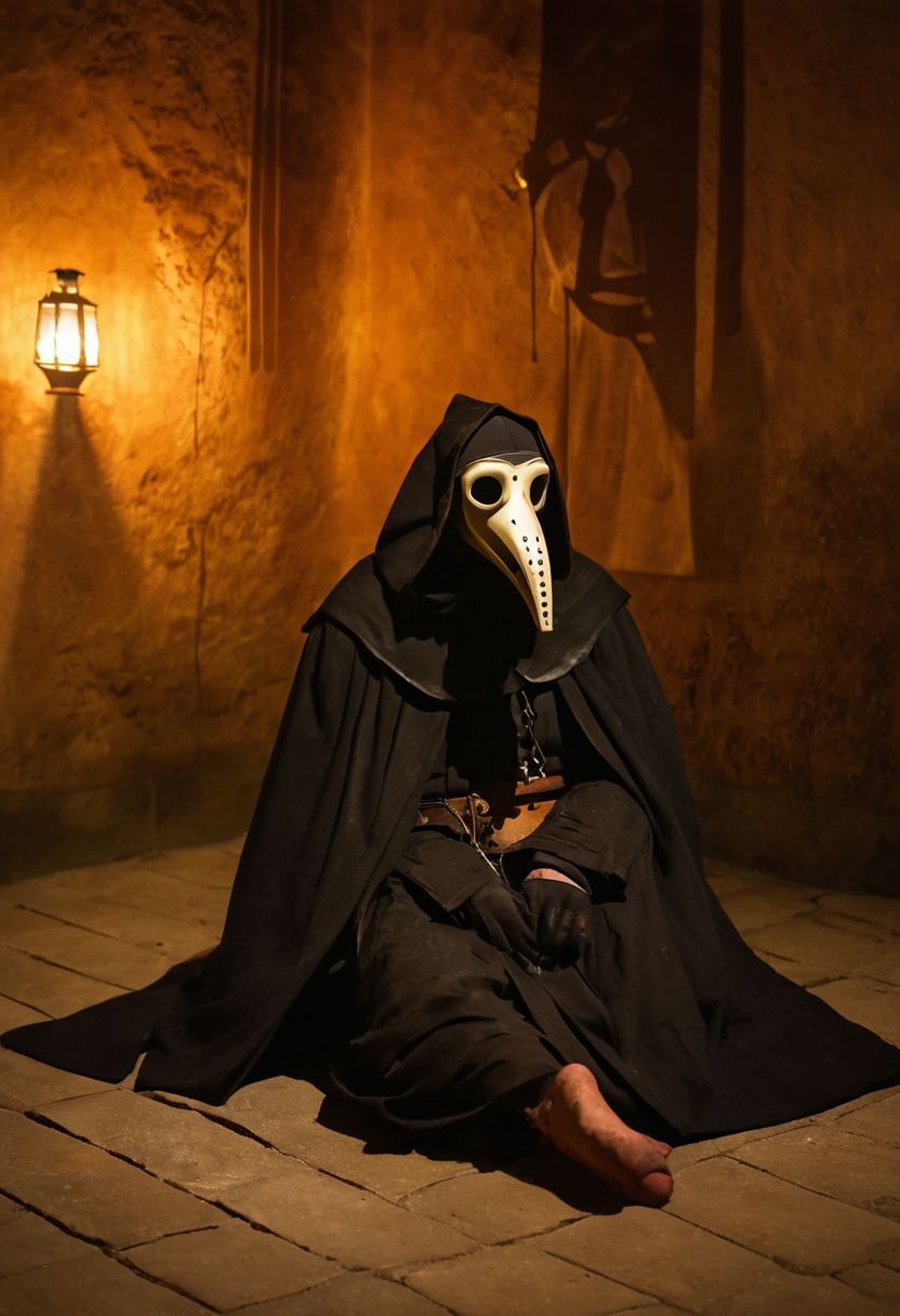A dramatic and haunting depiction of a plague doctor from ancient times, dressed in their iconic beaked mask and robe. They are tending to suffering victims lying on the floor, all with expressions of pain and despair. Lanterns hang from the walls, casting eerie shadows and a dim light across the room. The atmosphere is heavy with sorrow and the weight of history, reminding us of the devastation caused by past pandemics.
