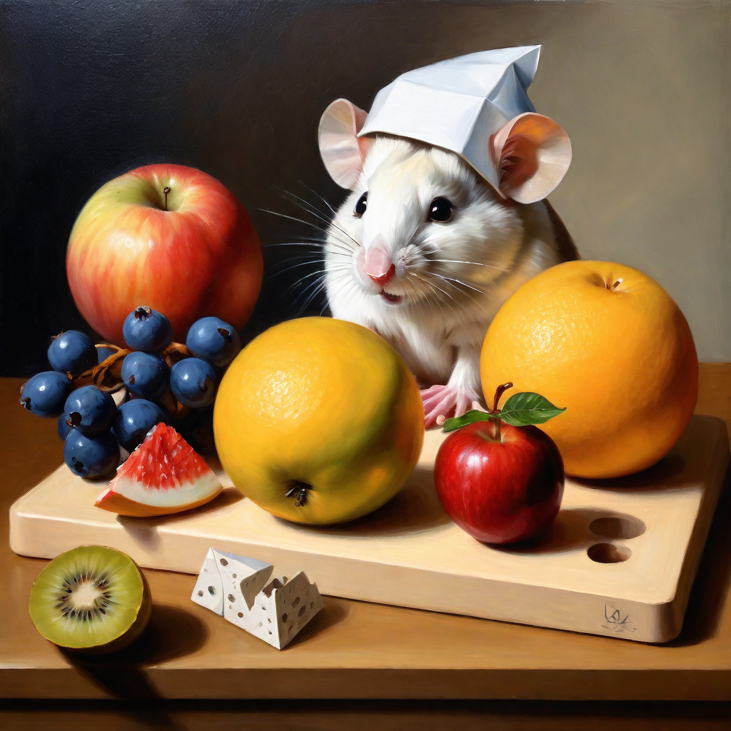 (oil painting)1, (art)1, platonic solids on a breadboard with fruit, jan vermeer style, with a cute mouse wearing a hat