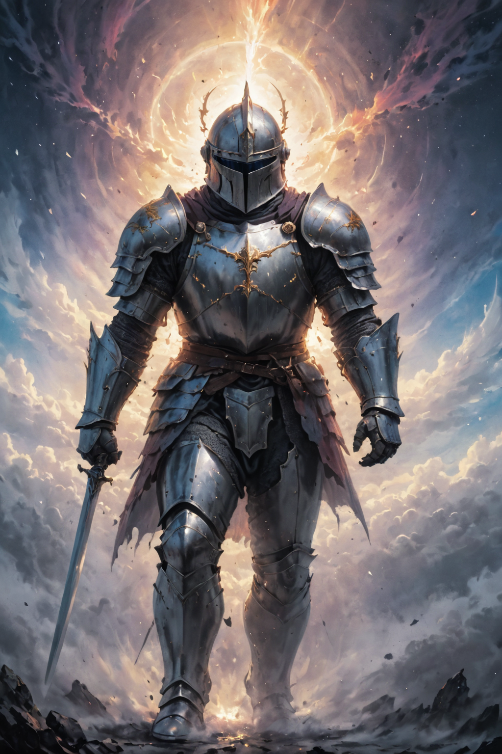 cosmic canvas,(cloudscape ,fantasy background), flawless, clean, masterpiece, portrait of a powerful knight, wearing helmet, <lora:Cosmic_Canvas_SDXL:1> epic