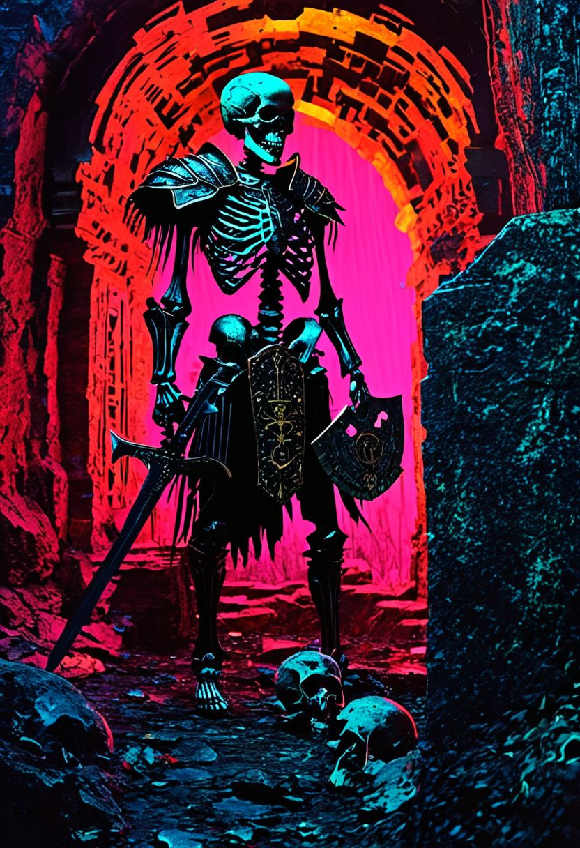 skeleton warrior with a cracked shield, guarding an ancient treasure in a forgotten tomb silhouette , in the style of the decaying empire of Wrstreich, dark magic and grotesque creatures abound, inspired by Sean Aaberg's punk aesthetic, dark fantasy world combines grim landscapes with vibrant, exaggerated neon colorful art, old 80's VHS dark fantasy, VHS screen grab, grainy, old footage