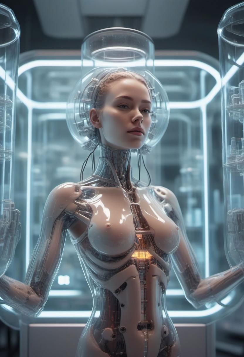 a very beautiful cyborg made of transparent glossy glass skin surrounded with glowing tubes inside an incubator of a futuristic hospital bio lab, rendered by beeple, by syd meade, by android jones, by yoanne lossel, by artgerm and greg rutkowski, space art concept, sci - fi, digital art, unreal engine, wlop, trending artstation, RAW photo, 8k uhd, dslr, soft lighting, high quality, film grain, Fujifilm XT3