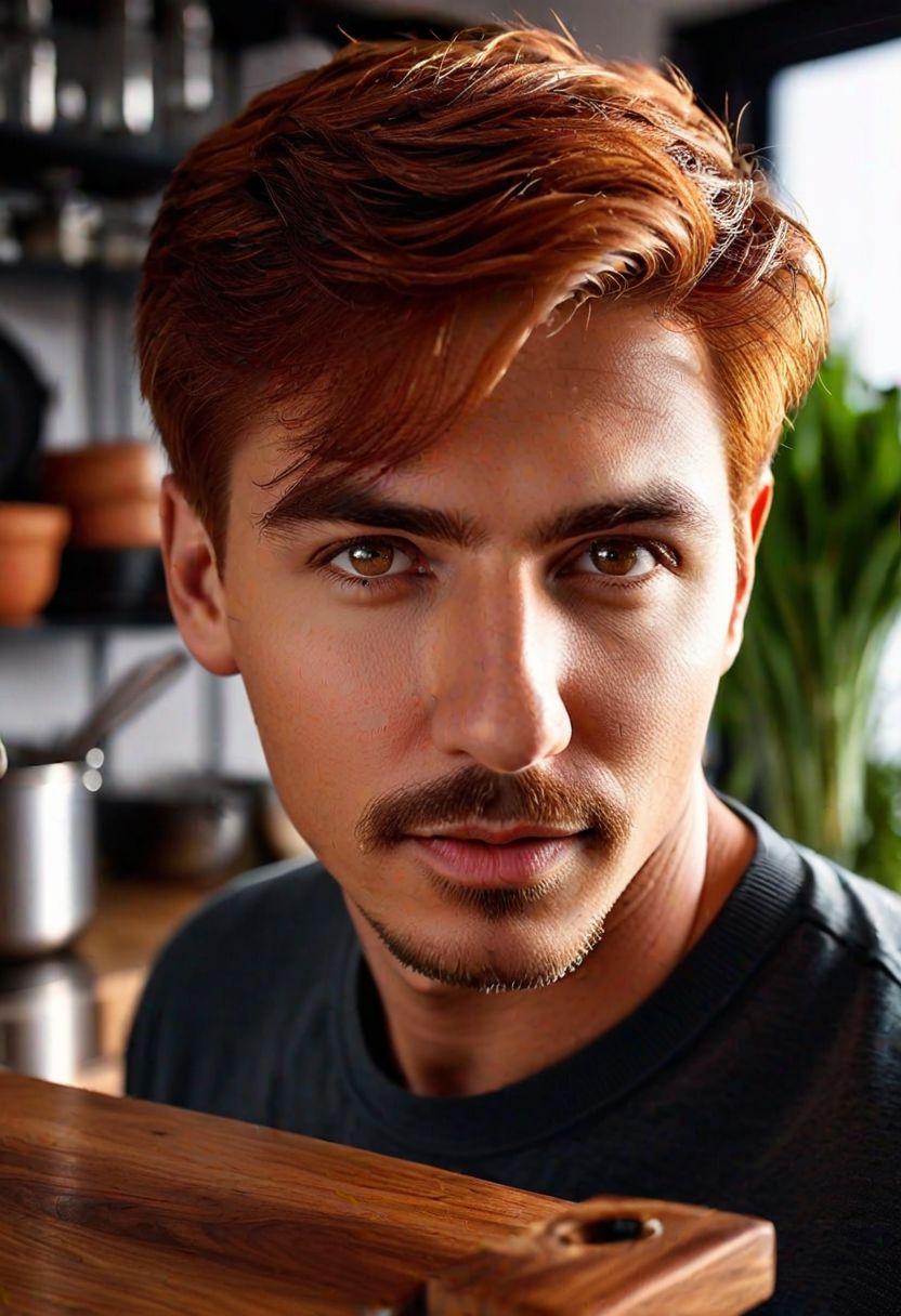 realistic, photograph, (masterpiece), 8k quality, (detailed eyes:1.2), (highest quality:1.1), highly detailed, majestic, top quality, best quality, newest, ai-generated, (intricate details:1.1), extremely beautiful, elegant, majestic, immersive background+, (detailed face, perfect face), (1boy:1.2), (short-goatee), short red hair, shining glowing brown eyes, very high resolution eyes, detailed round iris, brown eyes, standing, looking at the viewer, with a container in hand, dynamic posse, angled posse, a kitchen full of life and color. The aromas of spices and freshly cooked foods fill the air. Pots and pans hang neatly above the center island, and the drawers are filled with kitchen utensils of all kinds. In one corner, a small wooden table serves as the perfect place to enjoy a morning cup of coffee