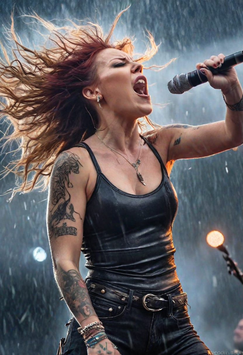 (very detailed)1, (best quality)1, (best resolution)1, (realistic)1,she's the hard rock woman, rocking out to a wild tune in the face of a raging storm, singing into the microphone, lights, lightning, BREAK, outdoors. intense emotions, fire, chaos, tattoos, the concert at the end of the world