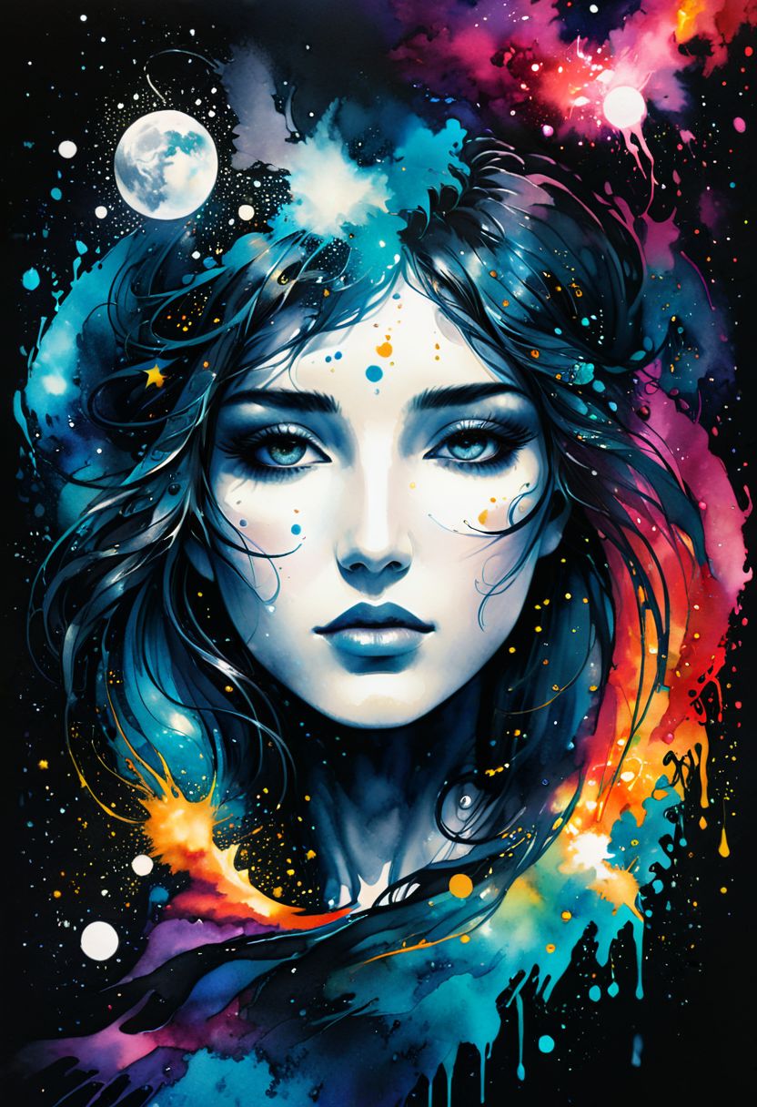 Goddess of the cosmos, draped in galaxies, holding the fabric of space-time, eyes reflecting infinite universes, ink illustration, Inkstains, splash art by Waterhouse, intricate details, Debbie Boom, Marc Allante, Wadim Kashin, reimagined and restyled by Anton Fadeev, deep color, depth of field, maximalism by Minjae Lee, CGSociety, rich contrast, Behance HD, Photoshop after effects. <lora:xl_more_art-full_v1:0.3>