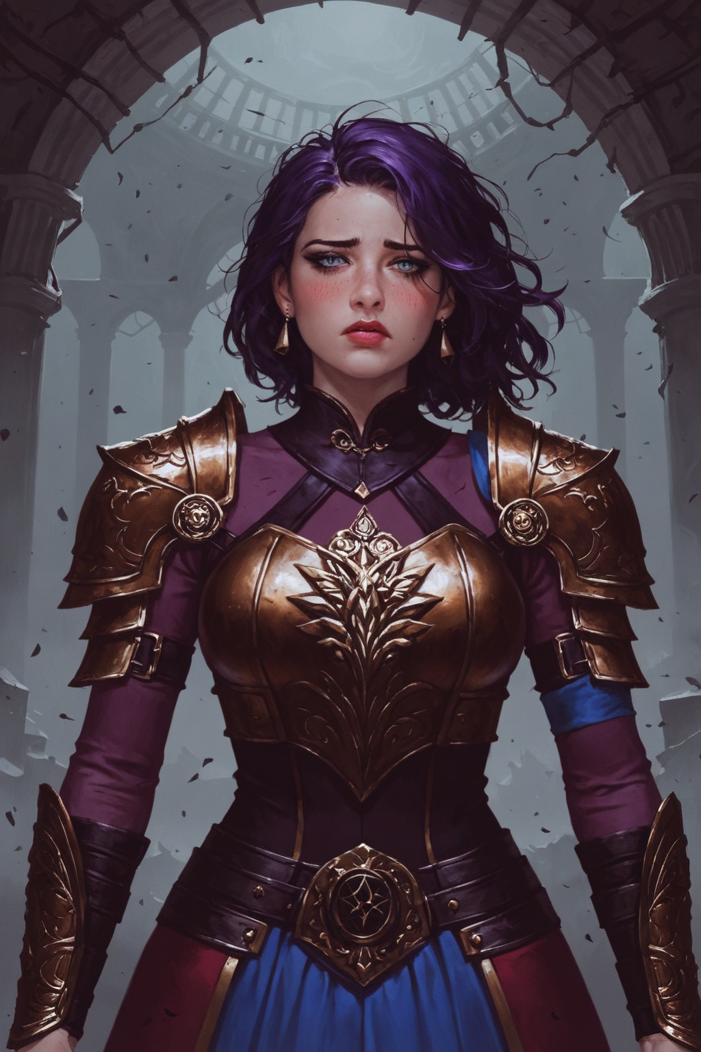 score_9, score_8_up, score_7_up, score_6_up, score_5_up, score_4_up,(best quality, masterpiece, high resolution:1.2),(1girl:1.1),dynamic pose,(wearing violet breastplate and armor:1.1),vibrant purple-blue haircolor, fine detailed face, blush,elegant,totaly exhausted,in despair,sad,melancholy,fear,tired,messy hair,expressive eyes, BREAK ancient ruins on background,giant statues,gloomy, muted colors,violet color guide,dominant colors black and violet, horror \(theme\),unsettling ,alone in a dark, mysterious,(dark,darkness:1.2),foggy,dim light,light particles, dense atmosphere, detailed,oil painting,award-winning concept art,painted in high resolution,artistic, poignant atmosphere,melancholic aura, hauntingly captivating,dark fantasy art,dramatic,zoomed,nsfw, <lora:Radiant_Darkness:0.95> Radiant Darkness <lora:Concept Art Twilight Style SDXL_LoRA_Pony Diffusion V6 XL:0.8>