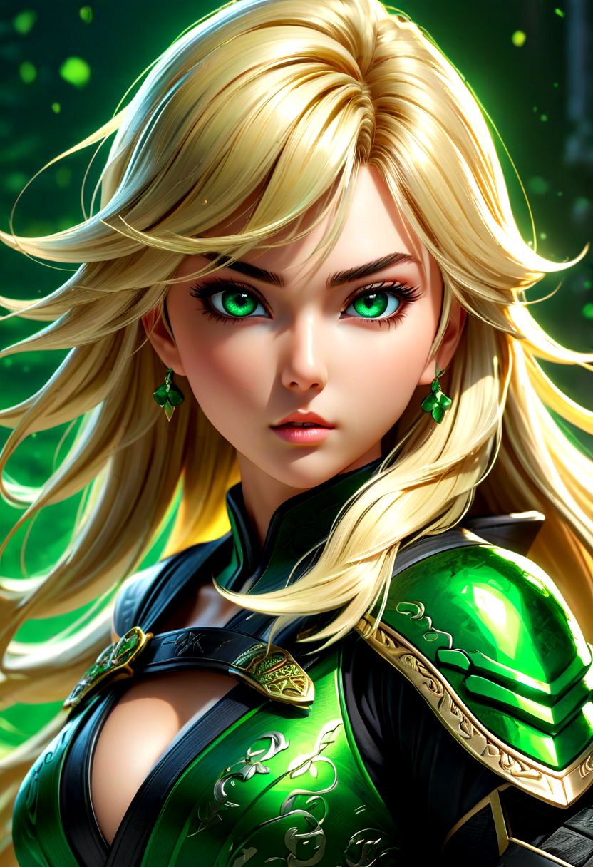 masterpiece,HDR,trending on artstation,sharp focus,high contrast,8K,Hyper-detailed,intricate details,cinematic lighting, <lora:add-detail-xl:1> perfect eyes, crystal clear eyes, nsfw, hyper maximalist , green theme, blonde hair, image presents a stylized ninja, characterized by vibrant and abstract splashes of emerald green. the main figure, the ninja, is depicted in a dynamic pose, holding a sword, which suggests action or combat. the background features bold and expressive brush strokes that create an energetic atmosphere. the colors used are vivid and varied, with multiple shades and hues creating a lively visual experience. overall, the style can be described as modern and artistic, with a strong emphasis on movement and energy.
