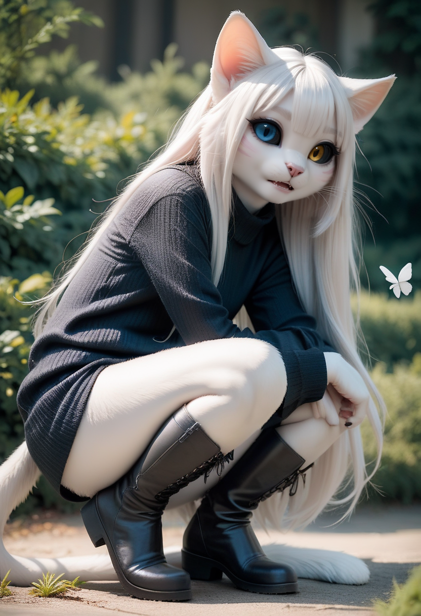 score_9, score_8_up, score_7_up, source_furry, Odd-eyed cat girl, open_mouth, Black Sweater, knee boots, colored sclera, white hair, long hair, heterochromia, black sclera, Furry, squatting on the grass, severe tail, Butterfly, Cool colors, depth of field, detailed background, photo, photo, photo