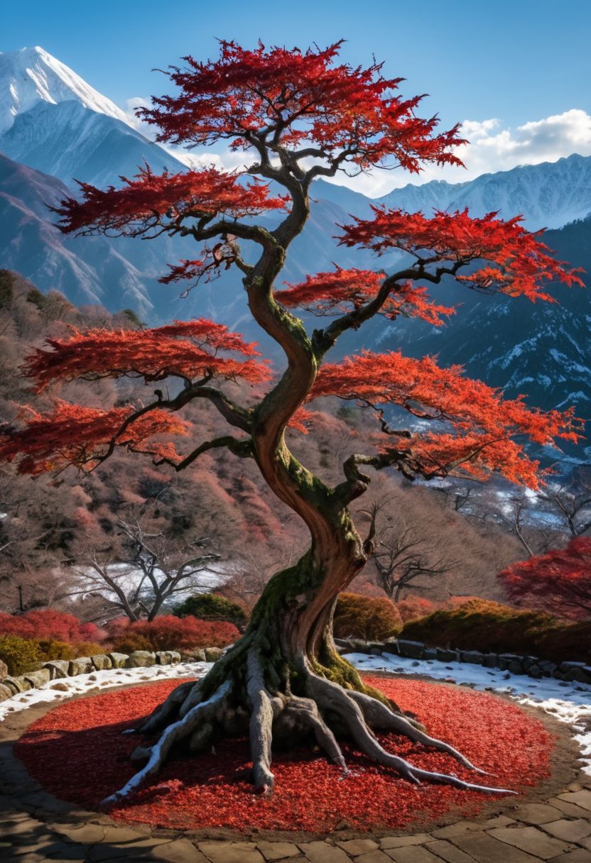 Extremely high quality, photorealistic, ultra-detailed, (a large Japanese red maple, the tree is surrounded by bright red leaves covering the ground, gnarled branches, an old tree in the foreground, snow capped mountains in the distance, a contrast between the color of the location and the bleak barrenness of the mountains in the distance), photo studio quality, realistic skin and hair, realistic skin texture, best quality, masterpiece, hyperrealistic, extremely high resolution, intricate detail, award winning, exceptional quality, 32k, 16k, 8k, 4k, UHD, HDR, rich contrast creates depth and distance, artistic representation should convey the sense of being in feudal Japan, seeing the beauty and the bleakness, professional photographic quality, astounding detail, volumetric lighting