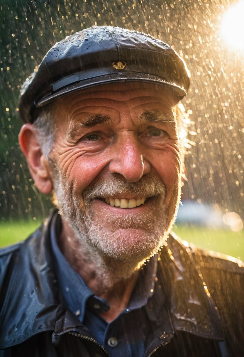 candid portrait of an old postman in heavy rain smiling at the viewer, golden time, backlit, sun flare
