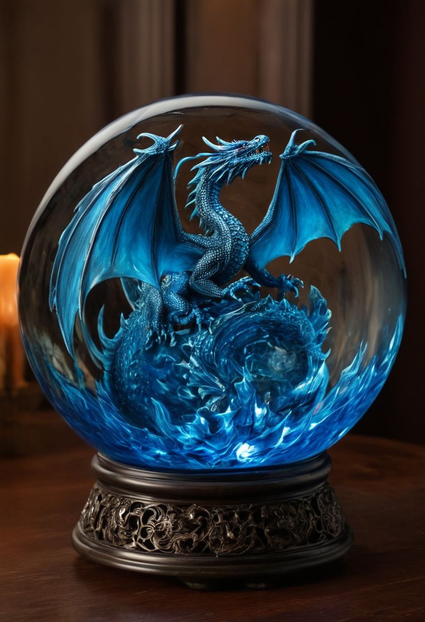 extremely high-quality, photorealistic, and ultra-detailed image of a small blue dragon made entirely of flames, encased within a clear glass sphere. The dragon should have intricate, fiery details, with blue flames that give off a magical, ethereal glow. The glass sphere should be crystal clear, allowing the vivid blue flames to be seen in exquisite detail from all angles. The sphere is supported by an intricate and ornate stand made of dark, antique metal. The stand should feature detailed carvings and arms that extend upwards to wrap around the sphere, holding it securely in place. The composition should highlight the contrast between the vibrant blue flames and the dark, ornate stand, with rich colors, dynamic lighting, and a background that keeps the focus on the dragon and the sphere. Ensure the image is of the highest quality with masterpiece-level detailing, hyperrealistic visuals, and extremely high resolution (16k, 8k, 4k, UHD, HDR). The lighting should create a sense of depth and realism, with reflections and refractions in the glass sphere and a warm glow emanating from the flames.