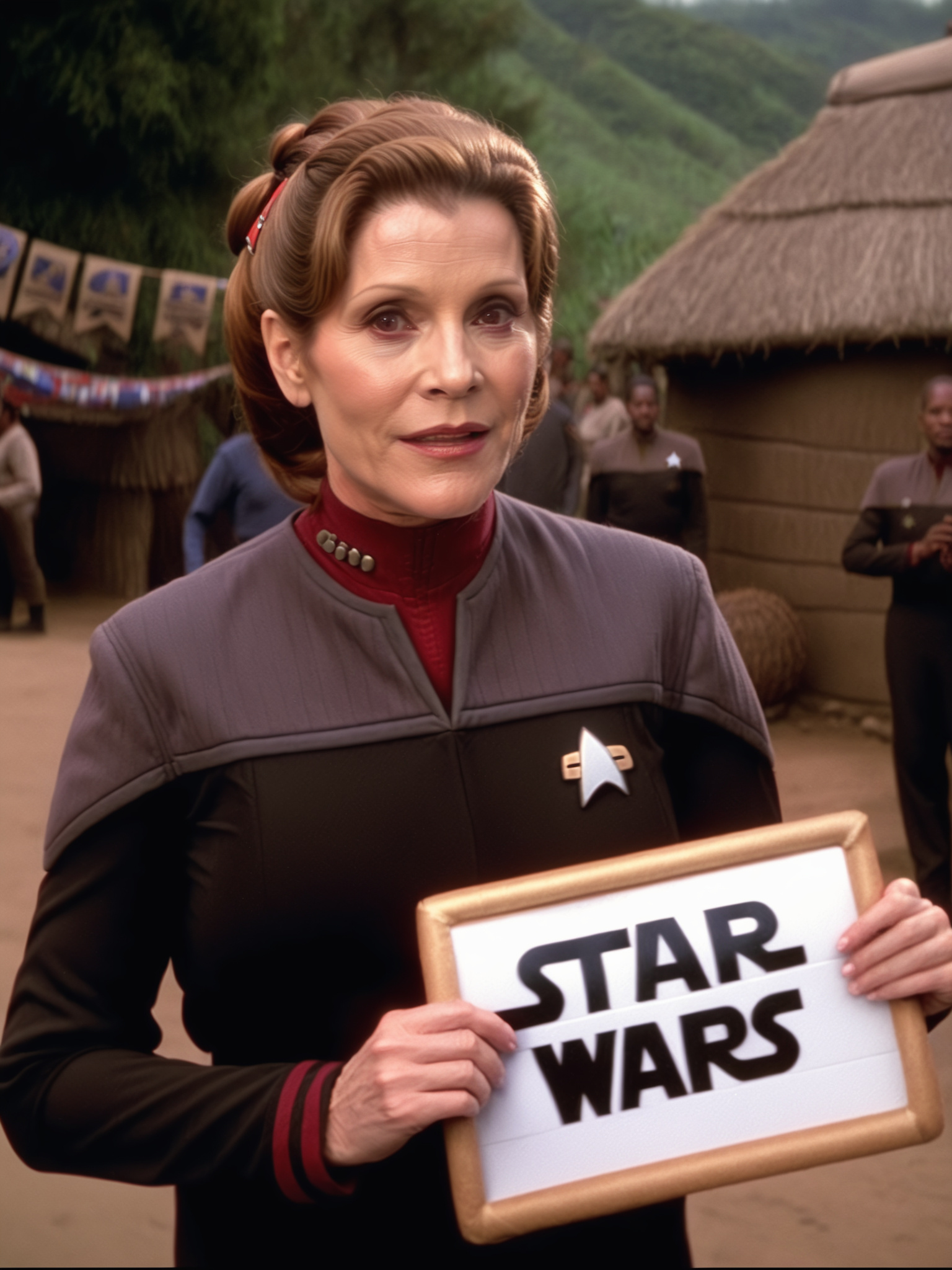 carrie fischer in black and red ds9st uniform,in a village,holding big sign with text "STAR WARS"<lora:DS9XLV21_16-000004:0.8>