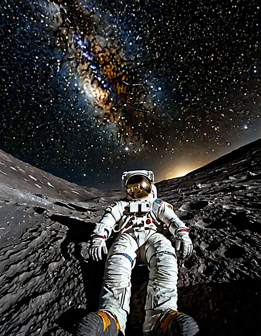 (((Ultra HD Detail))) photo, universe, starry sky, an astronaut sitting on the surface of the moon, (from_below:1.2), cinematic_angle, from behind, (starry night:1.2), galaxy, (look to the sky:1.1), looking_up, landscape, horizon