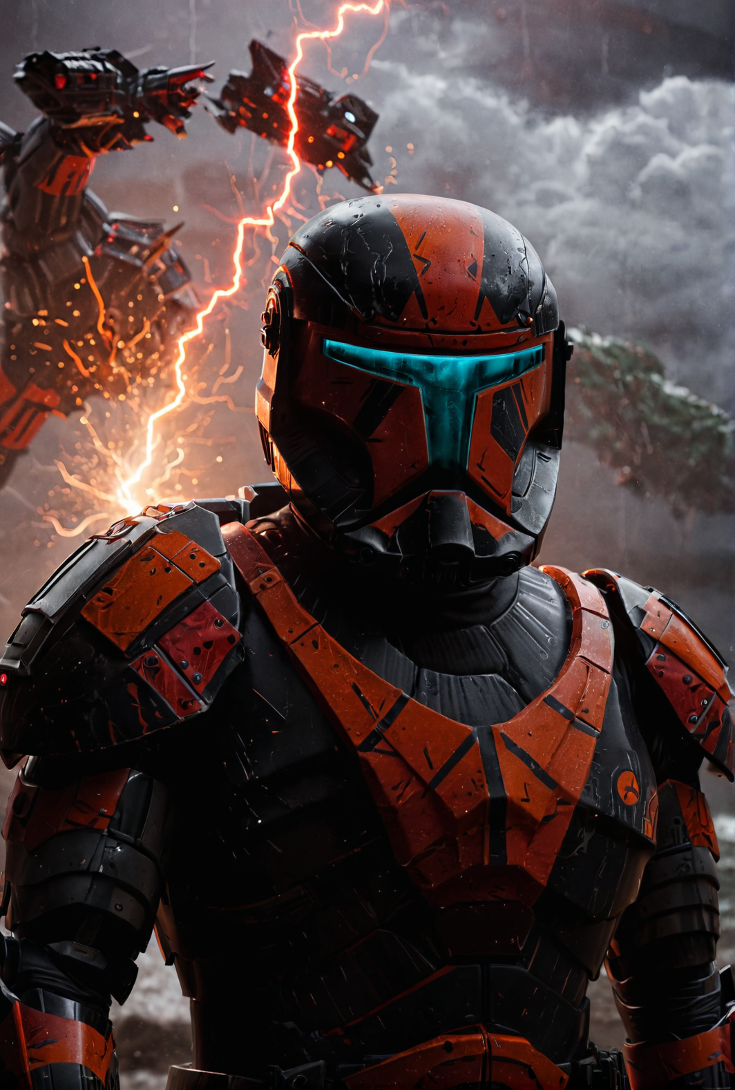7-CloneCommando micro photography, portrait, detailed helmet, thunderstorm, red and orange lightning all around, huge waves red and black armour, stripes and symbols, intricate patterns, high gloss black, matte black smooth armour, metallic surface, reflections, rtx cinematic masterpiece, slow motion, highly detailed armour, smooth reflective surface <lora:Clone Commando v1.0:0.8> <lora:add-detail-xl:0.5> <lora:xl_more_art-full_v1:0.5>