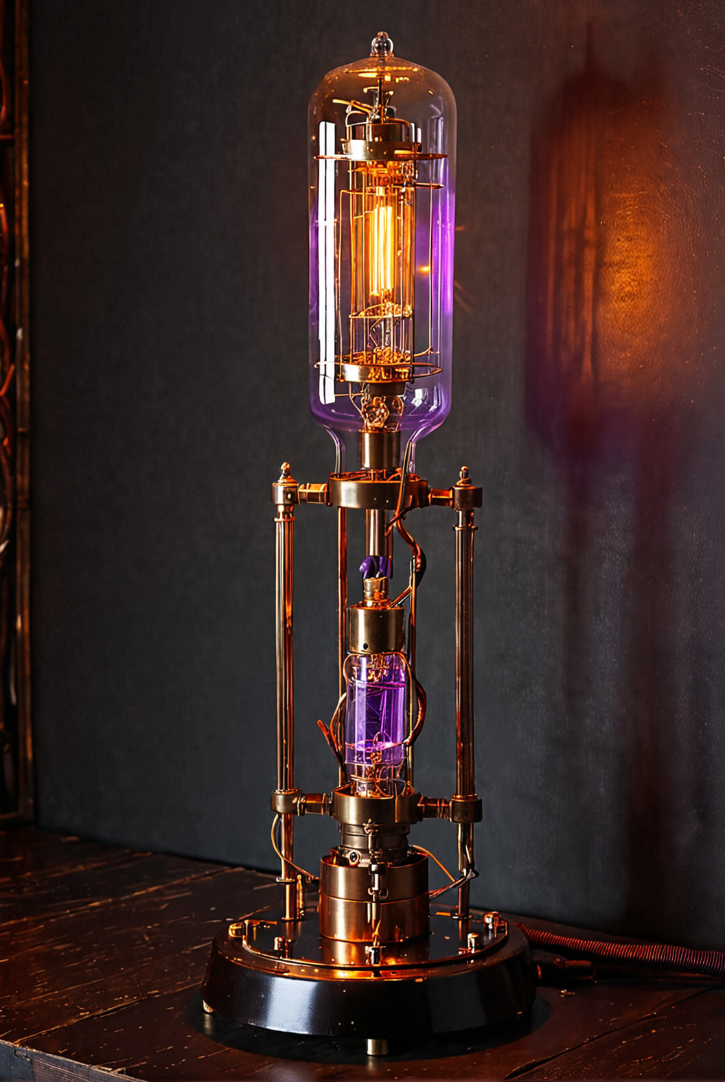 ((mechanical, tall lamp in dark room)), steampunk, vacuum tubelights, full view, abstract, realistic wires, reflective glass, art deco, lamp stand, brass, bronze, glowing orange and purple [reflections, vibrant lighting, realistic, high quality photo, 4k, hd] <lora:Vacuum Tubes v1.0:0.6>