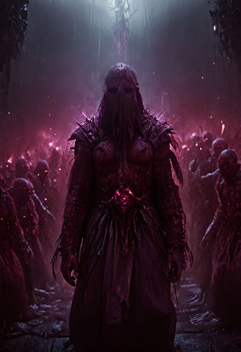 satan monks army, hundreds, lots endless monks, strong bright, a vivid testament to her inner strength and focus, scary, beauty, horror, dark fantasy, creating epic cyberpunk scene with desaturated translucent dark red and beige details, colorful with vibrant colors, pink theme, purple theme, dark theme, art by Kelly Slater and Wadim Kashin, best quality, masterpiece, photorealistic, highly detailed, approaching perfection, dynamic, trending on artstation, sharp focus, intricate details, epic scene, cinematic lighting
