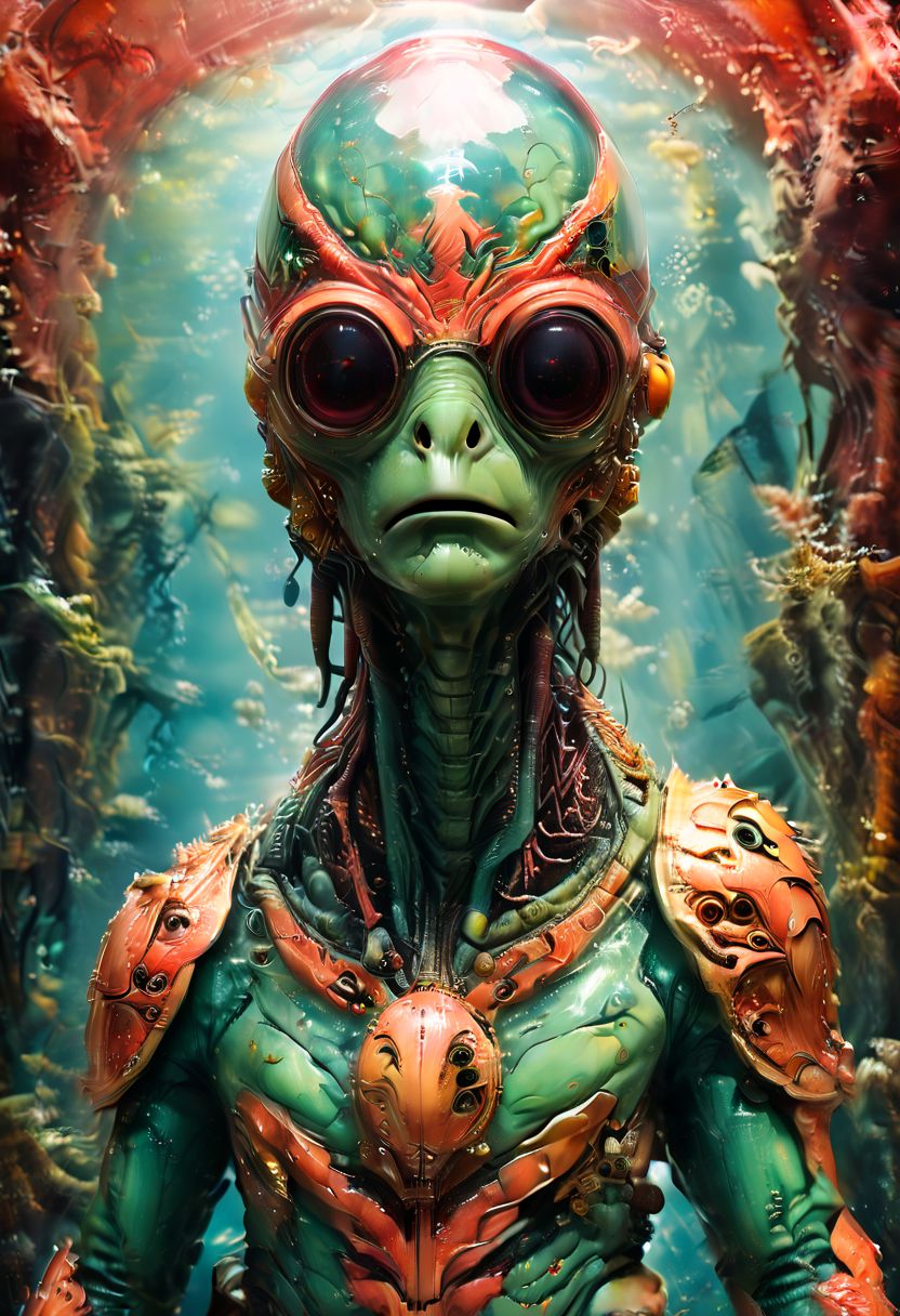 artialien, hyper realistic and highly detailed, an otherworldly creature, smooth skin, features resembling an amphibian, (light agua and red armor), glass dome, helmet, this guy looks really stupid, you can't help but laugh at him as he threatens to destroy your planet, doofus, moron,