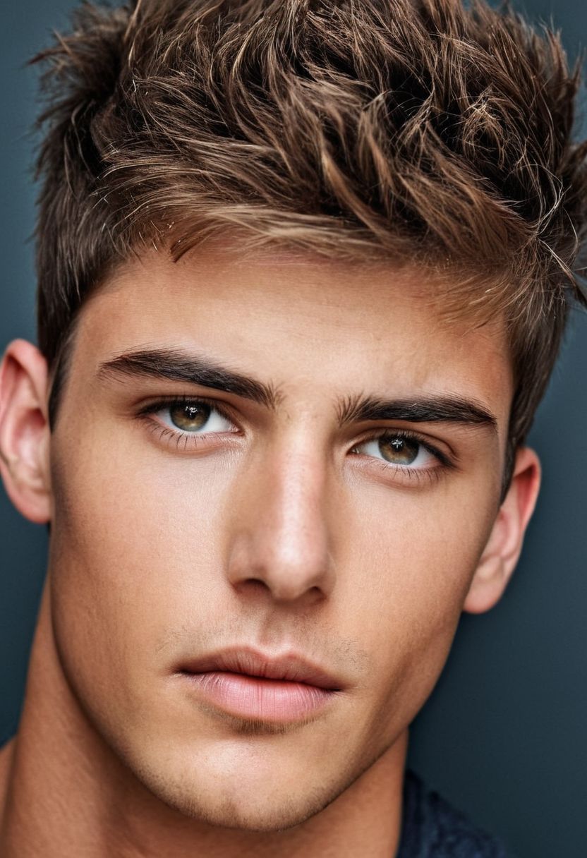 fashion photo, high resolution photo of a 25 years old insanely attractive male model, hyperdetailed photography, soft light, realistic skin, face, looking at viewer, model look, MDRN MALE HAIRSTLYE