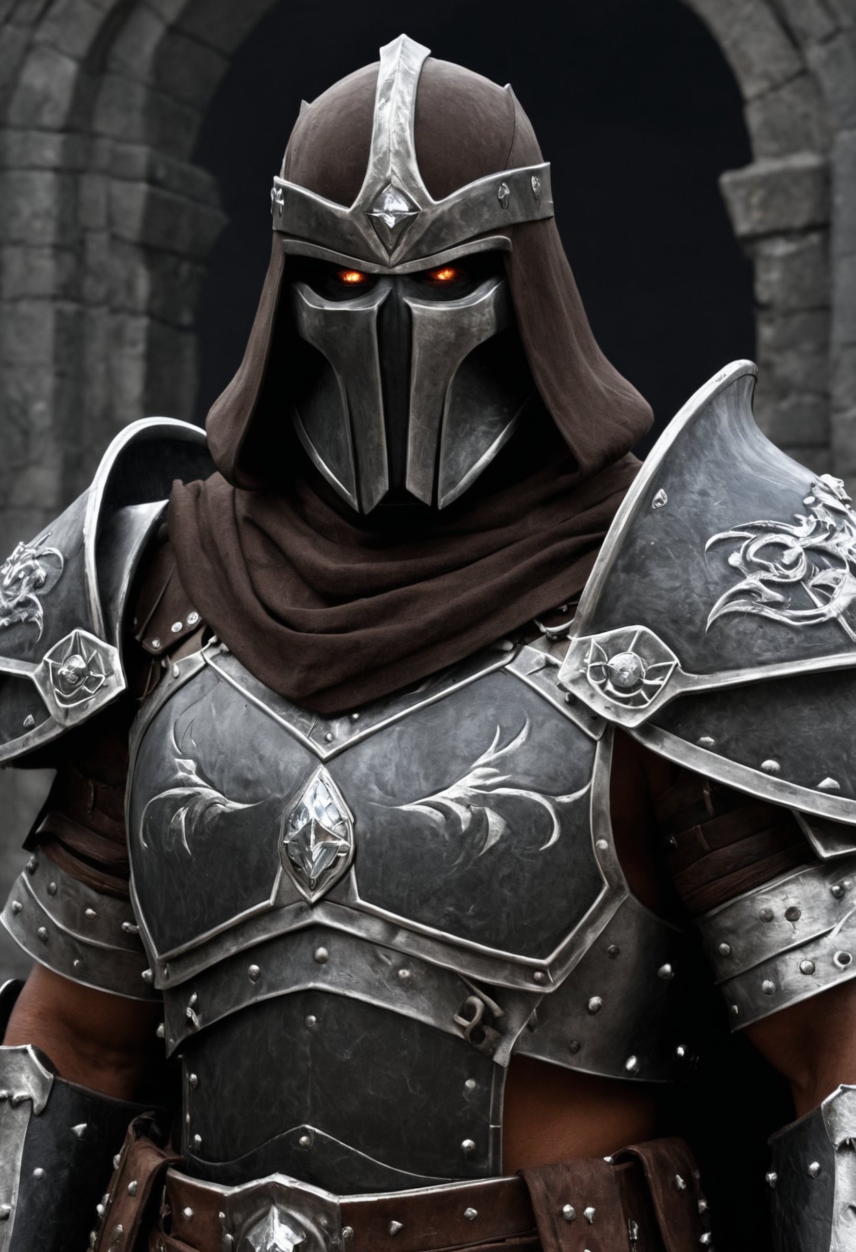 Fantasy d&d upper body portrait of a warforged with metal-textured skin,The executioner of doom,crystal eye,dark brown cloak,juggernaut barbarian,strong,Mighty,obsidian maul,castle,huge filesize,realistic,<lora:add-detail-xl:1>,