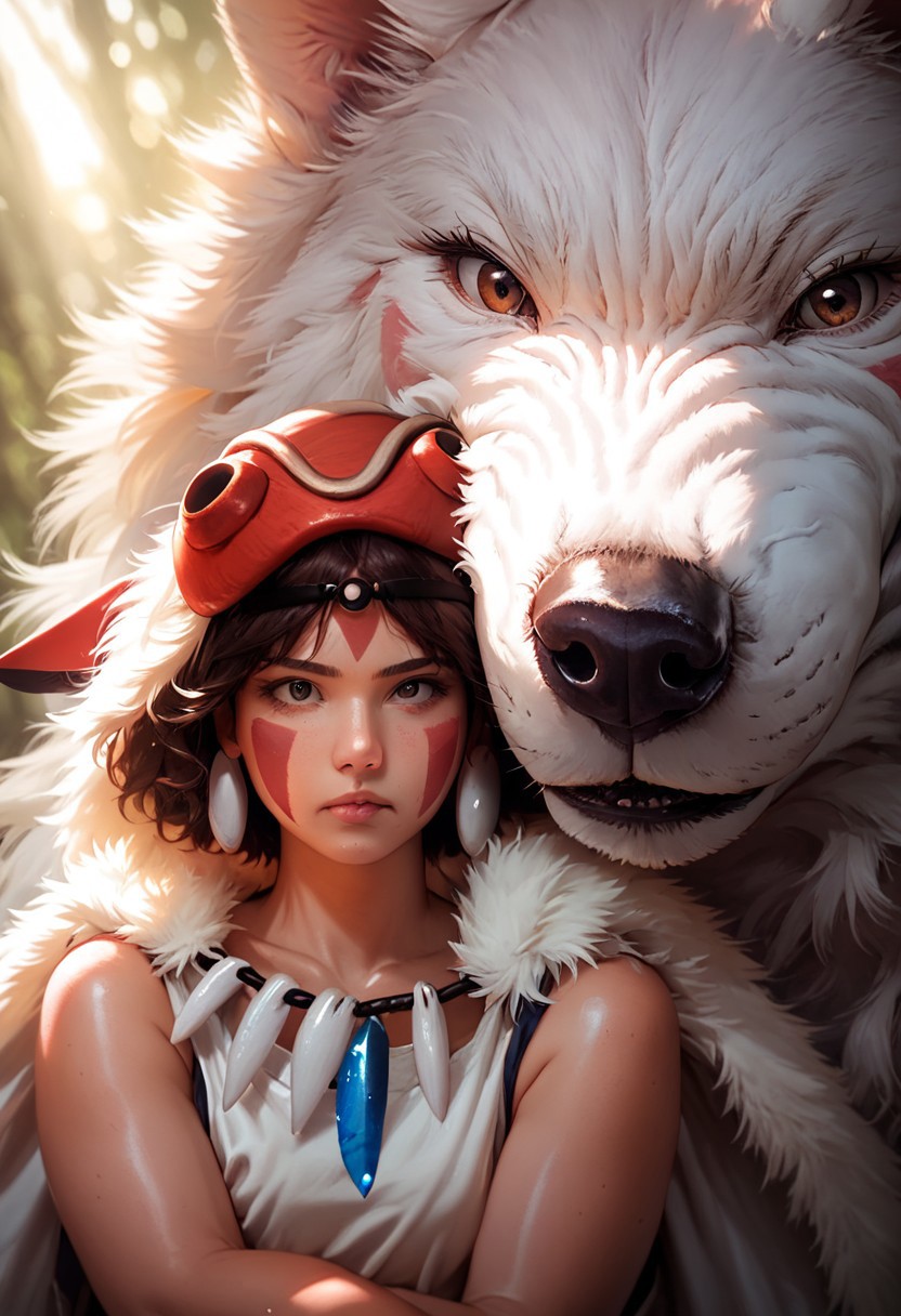 score_9, score_8_up, score_7_up, 1girl, San(/Princess Mononoke)/,(ultra HD quality details), pale skin, brown hair, facepaint, brown eyes, short hair, mask on head, shiny skin, eye contact, fur cape, crystal necklace, sleeveless_shirt, tilted angle, moody lighting, p3tl0v3, white wolf, hugging white wolf, dim lighting, medieval fantasy, perfect quality, high quality, photorealistic, sitting BREAK orange and blue hue, (abstract:0.2), expressiveH