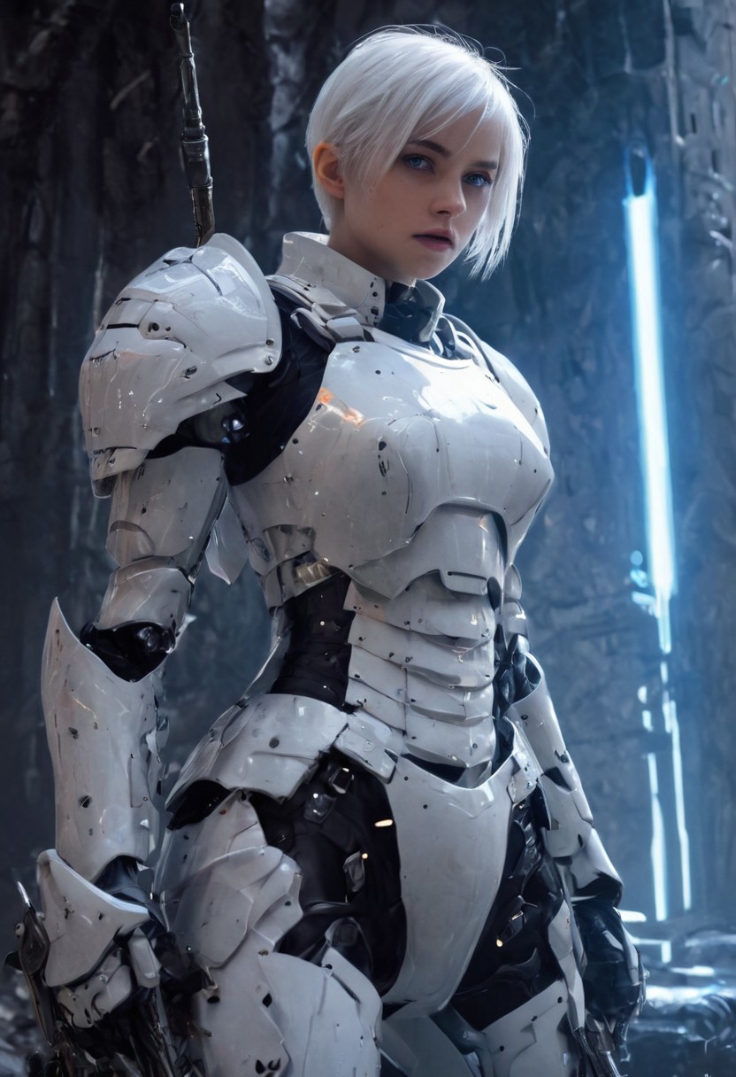 score_9,score_8_up,score_7_up,1girl,solo,white hair,short hair,blue eyes,battle,armor,plate armor,glowing,high contrast,intense,determined,dramatic lighting,cyberpunk,futuristic,sleek design,mechanical,knight,warrior,looking at viewer,dynamic pose,intricate design,sci-fi,highly detailed,metal,glowing accents,stone ruins,night,mysterious.,John Berkey Style page