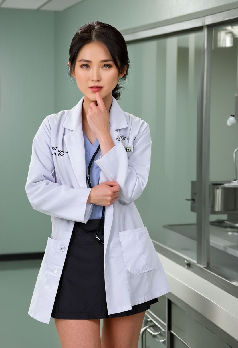 (cowboy shot: 1.2), elegant slim asian woman, brown eyes, Korean, wearing (((open labcoat over scrubs, skirt))), black hair, (okawaii koto, hand on own chin:1.5), (modern hospital), photo, ultra high res, realistic photorealistic, ultra-detailed, finely detailed, high resolution, perfect dynamic composition, (perfect eyes), (detailed eyes), solid circle eyes, sparkling eyes, (clean eyes), anatomically correct, super detail, textured skin, extremely detailed face and eyes, detailed facial features, ((perfect face)), gini_s2