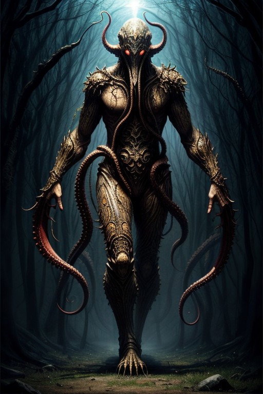 masterpiece, best quality, absurdres, illustration, photorealistic, 1other, monster, eldritch monster, full body, ethereal figure, tentacles, shifting dimensions, whispering shadows, ancient artifacts, glowing sigils