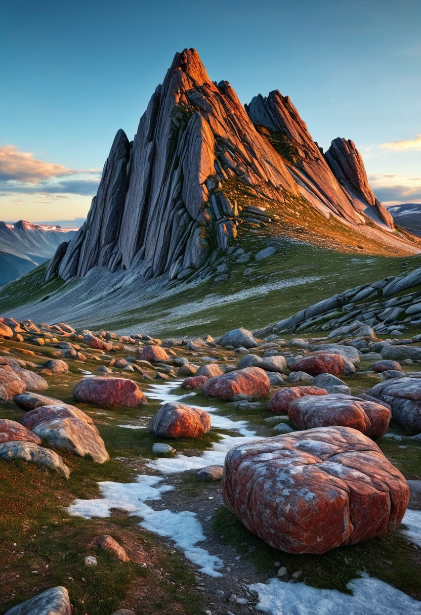 great rocks under the sky, dark unshakable mountain, enormous height, from beyond, award winning, Nordic aesthetic, depth peeling, clear scene, f/16, 8k, hdr, hyperrealistic, intricate abstract, intricate details, masterpiece, ethereal light